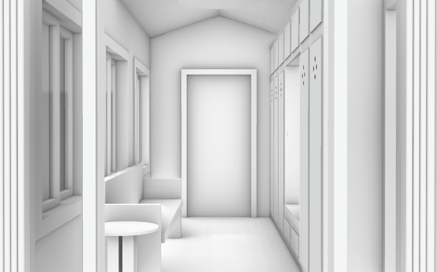 exterior shot the cubbies on the right should be a light yellow with shiplap panels the floor is a grid pattern natural brick in a red brown brick tone add the table lamp on the side table next to the church pew paint all the walls and ceiling pastel yellow including the window frames and mullions except for the door at the end the light should be dappled and romantic morning light from a garden outside flatten the ceiling keep a nook bench on the right side in the middle of the cubbies with no sconces anywhere