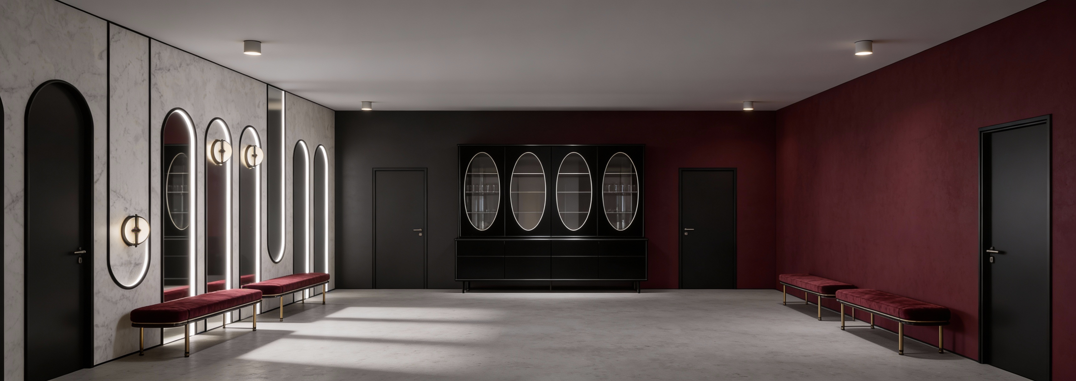 modern interior men changing room featuring the ceiling is subtle muted gray adding depth and balance floor is grey beton soft ambient lighting casts gentle shadows enhancing the elegant atmosphere on the left side is matte deep antracyt wall with deep antracyt door on the right side is matte deep burgundy wall with door on the front are two sitting in deep burgundy velvet with gold legs on the front wall on the left are four arched mirrors which are light by led and three archway with sconce on the right side of front wall are antracyt door on the celling are soft lamps in room is no window so the lighting must be great