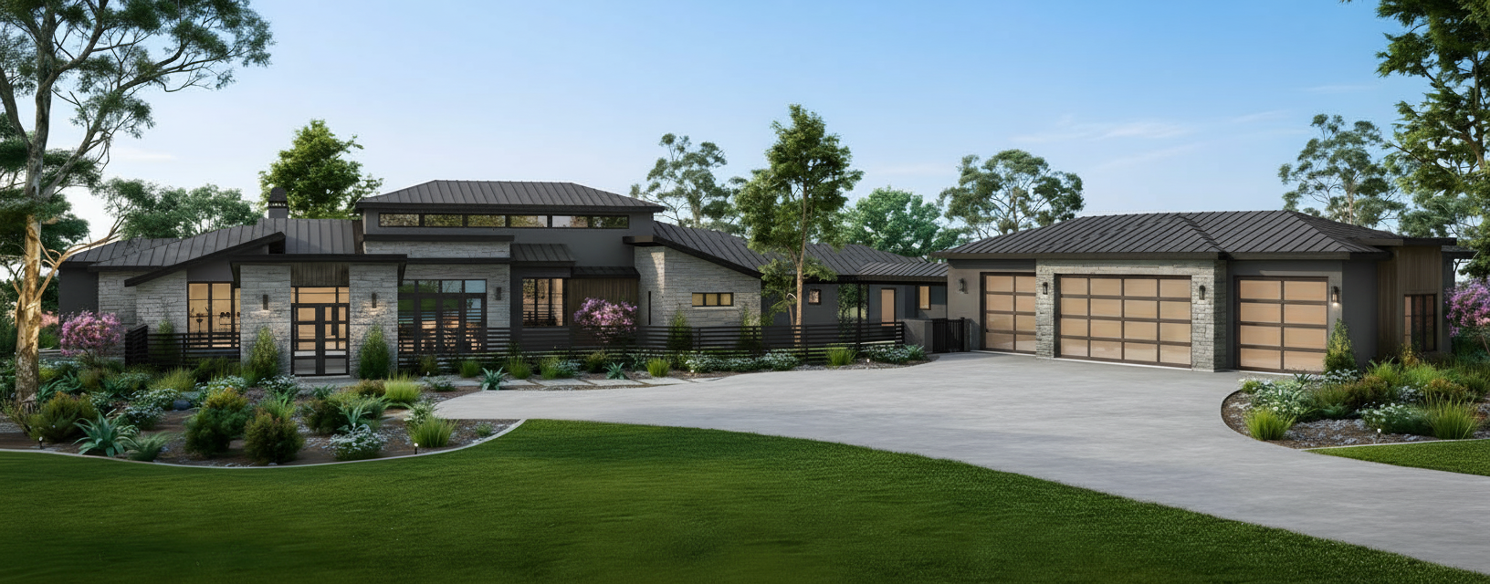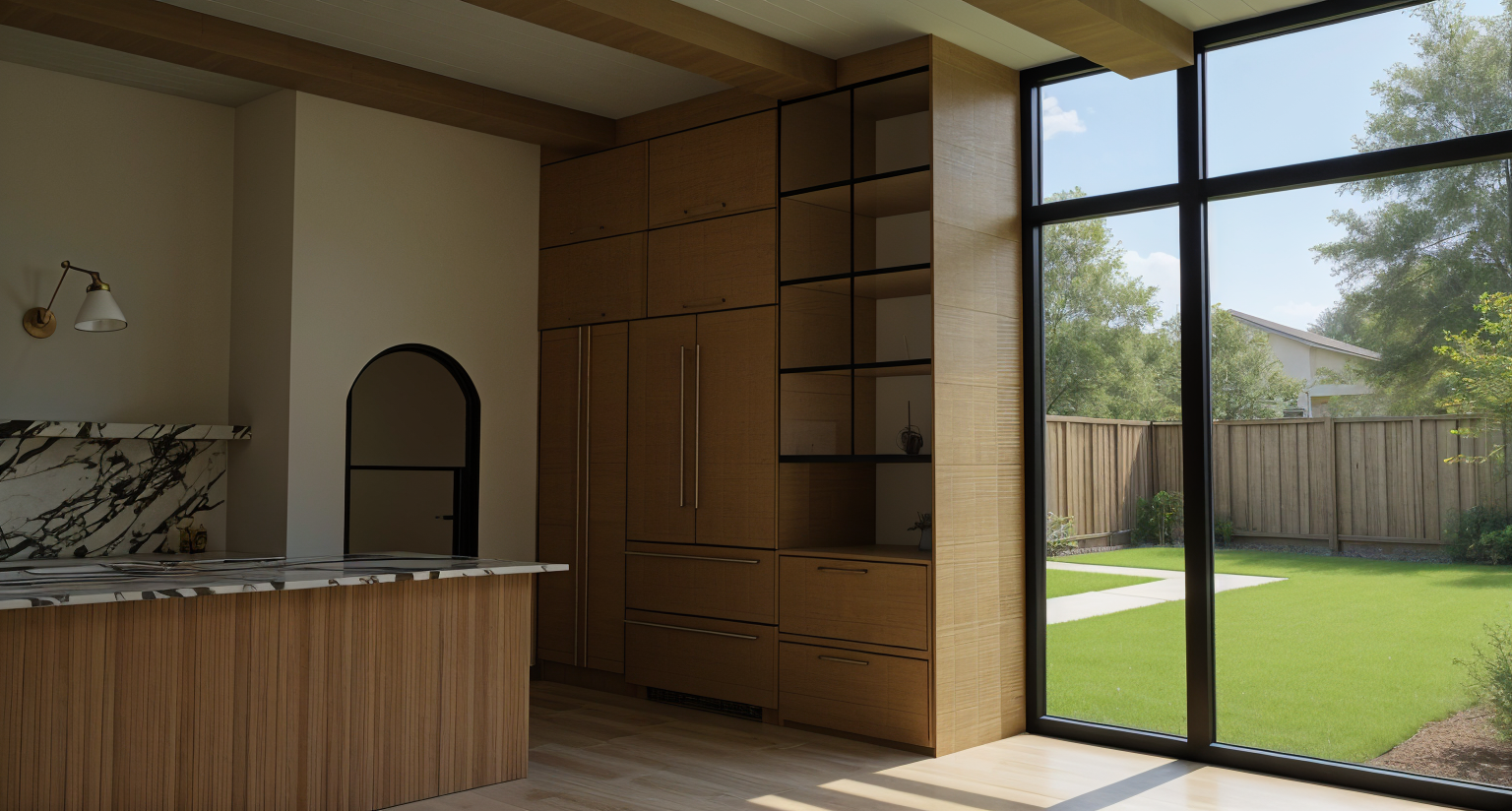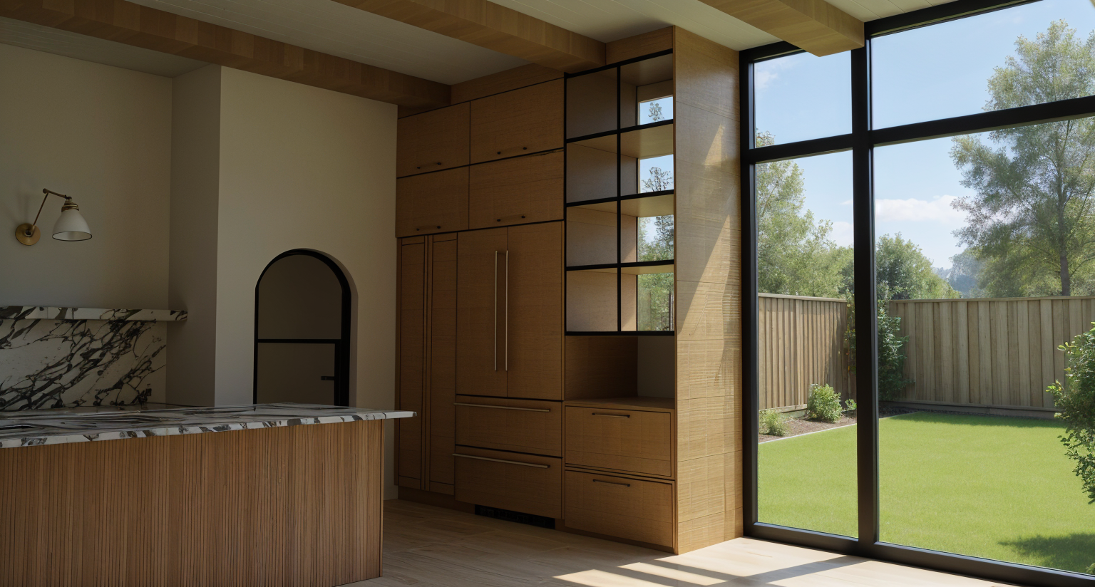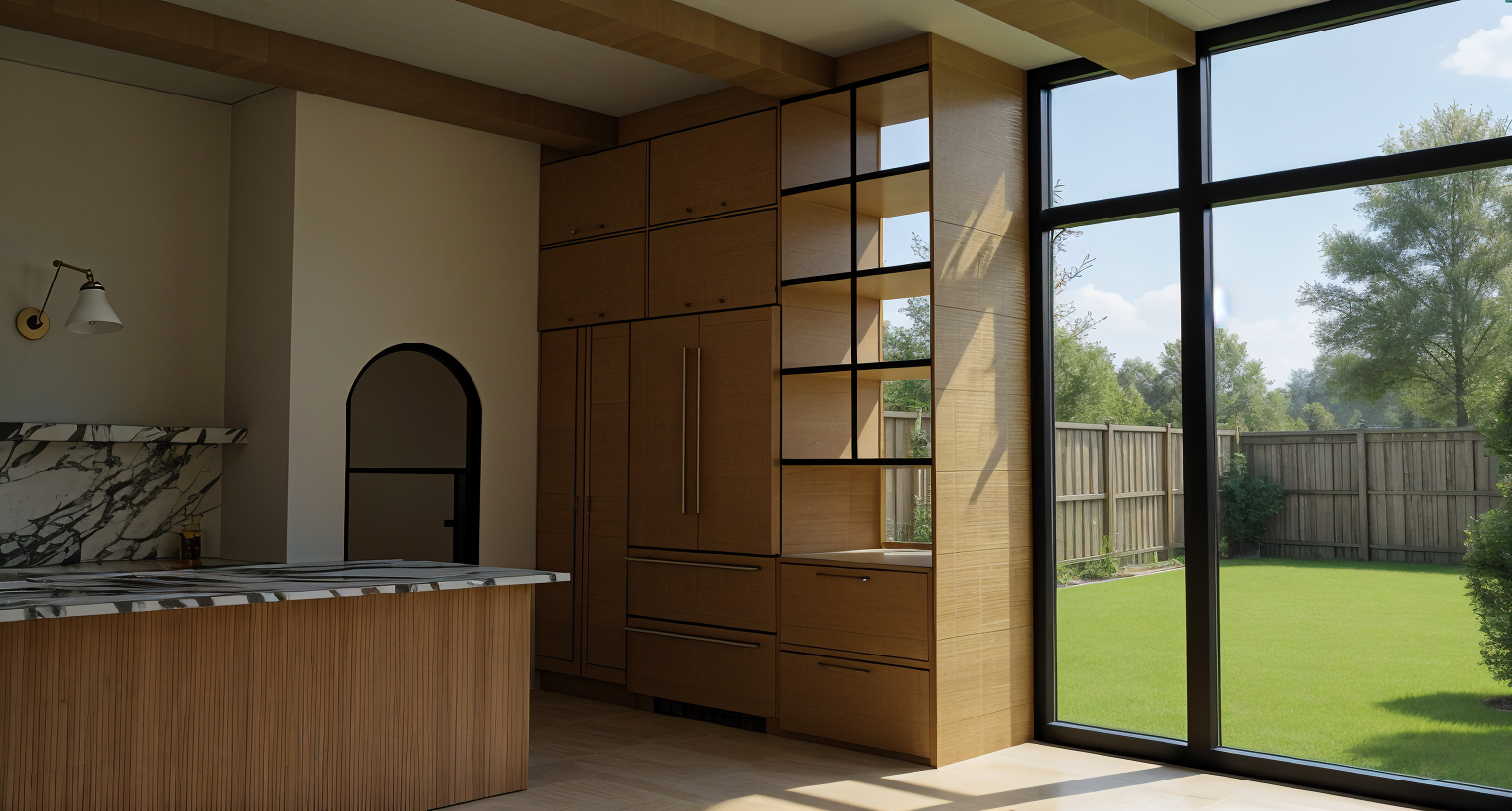 modernist exterior shot cria me uma imagem tridimensional com as cantarias em pedra calcaria e portas de madeira clara o edificio mais baixo cor rosa claro e o mais alto creme architecture