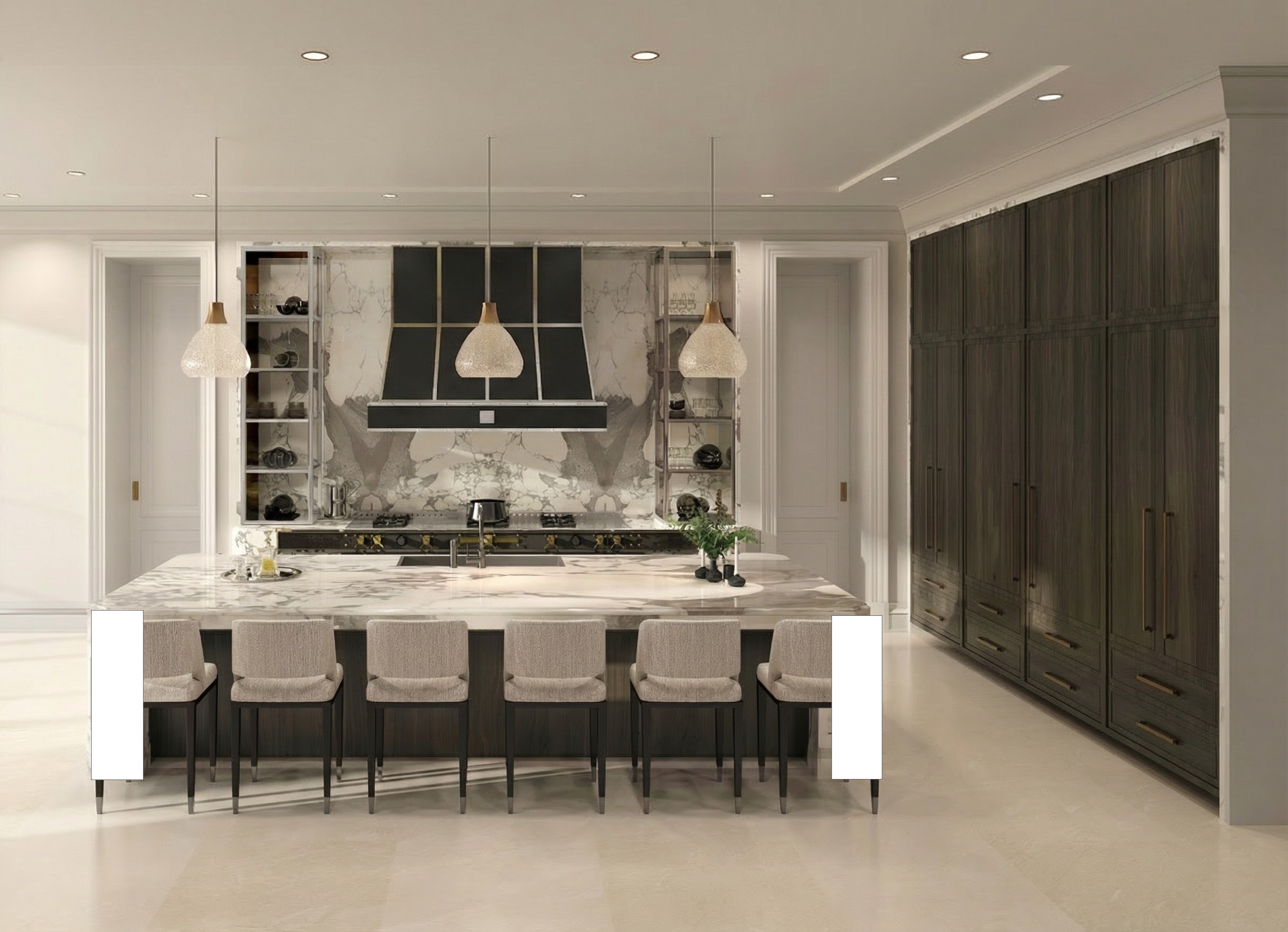 edit the existing kitchen render while preserving all original proportions lighting materials colors furniture and camera angle changes only do not add new elements reduce the distance between the island chairs make sure all 6 chairs fit inside the island s white boundaries no redesign no new props no changes to cabinetry countertops flooring or lighting maintain a highly realistic architectural rendering quality