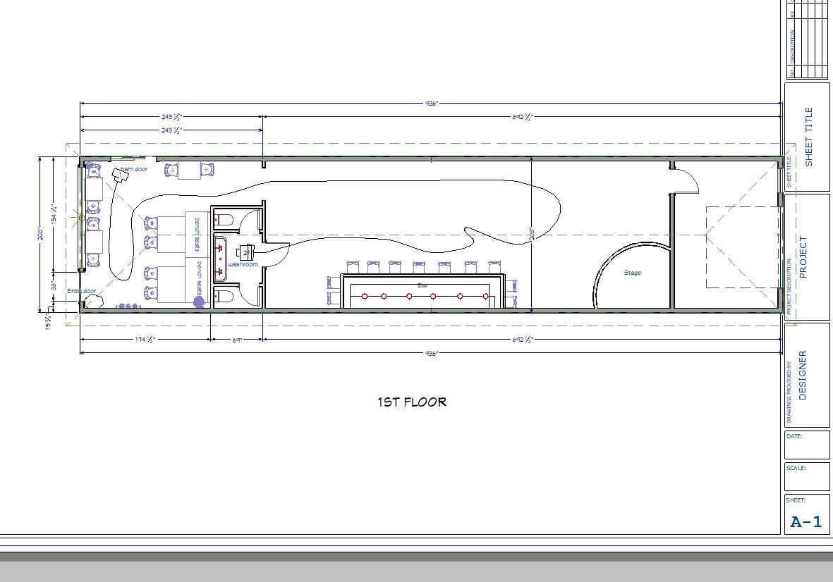 convert this floor plan into a realistic isometric 3d view of a full house show the space from an elevated angle with furniture walls and details visible this design has a industrial style with brick wall behind the benches and bar the floors are concrete add some lights for the stage area the walls and ceiling are black use the same furniture as shows on the plan do not change the orientation of the floorplan