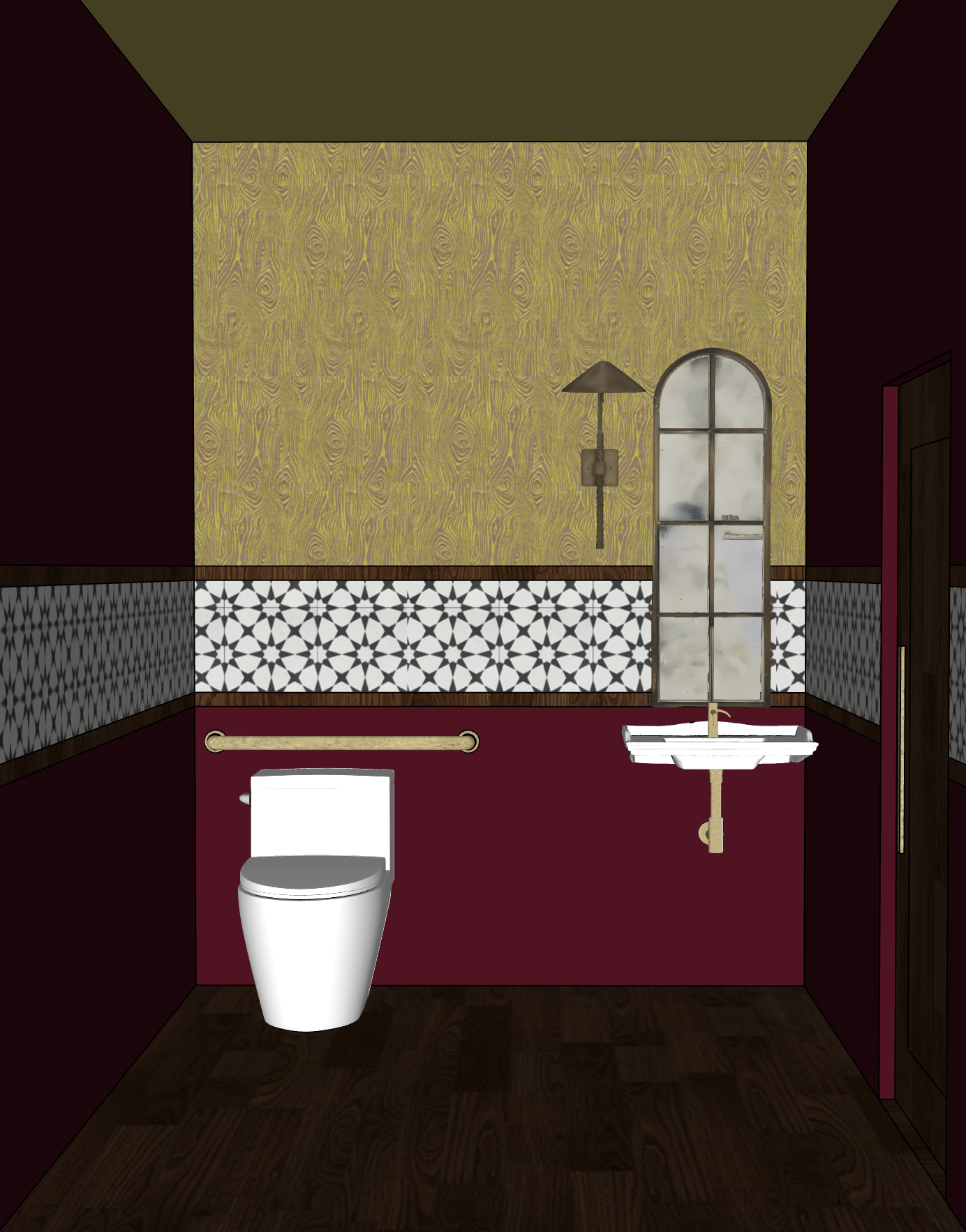 add the berry color to the ceiling as well refelect the wall across for the mirror into the mirror reflection