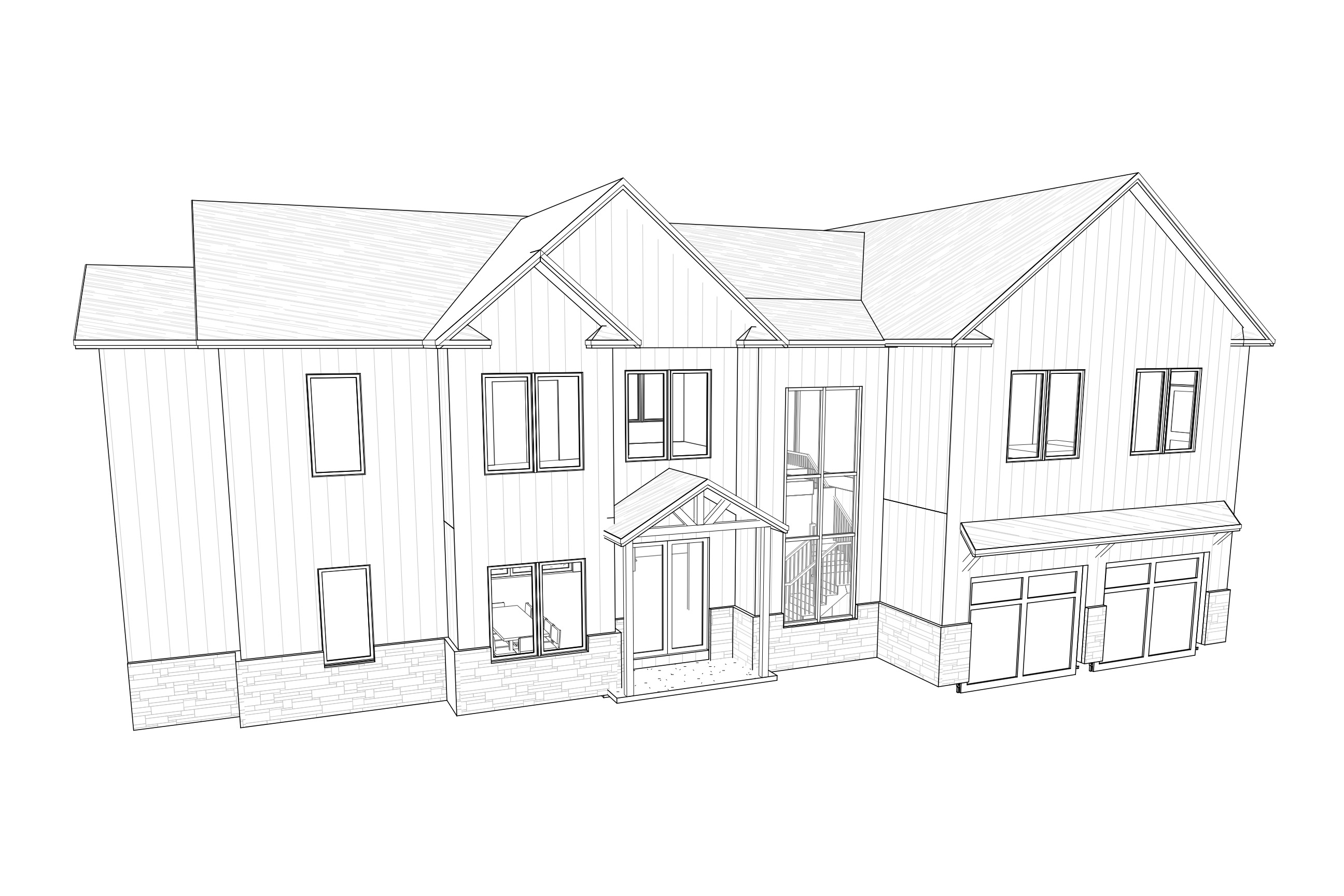 black asphalt roofing black trim black windows cream paint tar driveway to both garage doors walkwalk to front door pine woods background grass front lawn landscaping on either side of walkway mid day sun