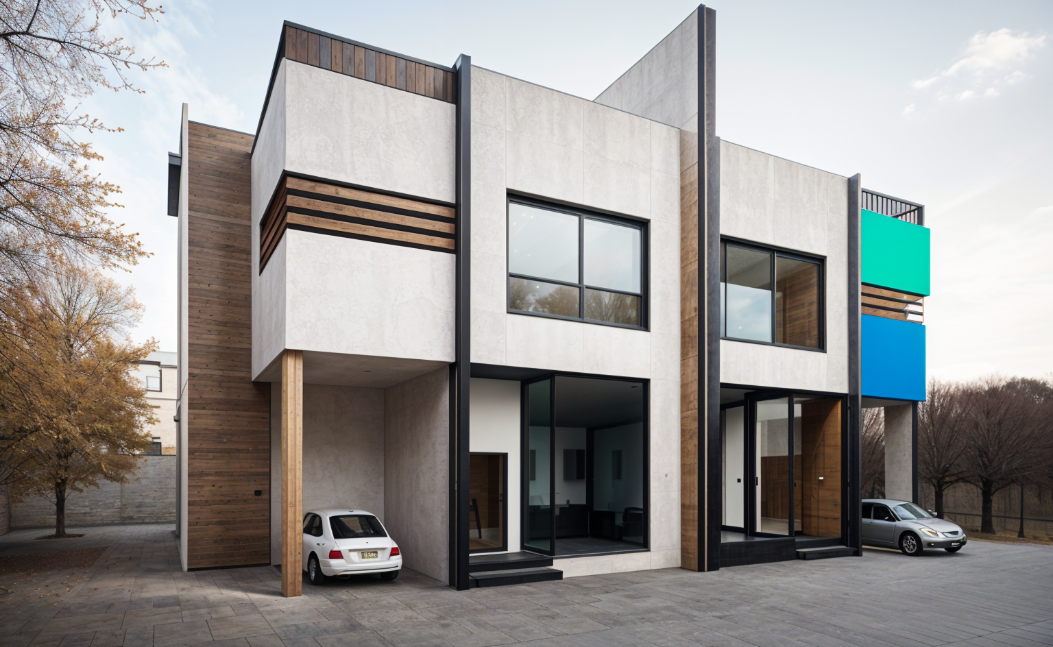 modernist night shot the upper cabinets are mirror now they look grey the light brown elements are whitewashed oak the countertop is white terazzo on the left there is no window there is also a whitewash cabinet with a silver fridge architecture