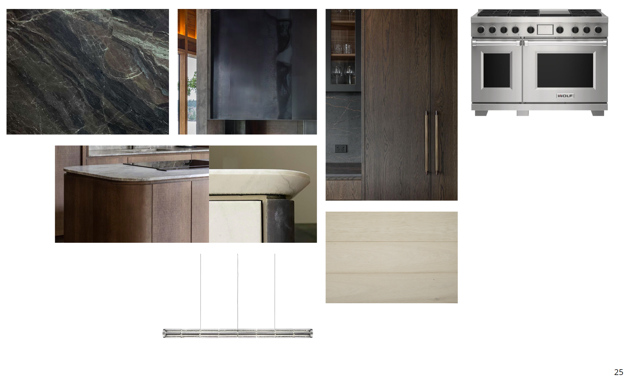 exterior shot ultra photoreal architectural kitchen rendering use the provided mood board strictly as reference for material palette texture and tone do not replicate layout or product imagery material direction deep green black veined natural stone with dramatic movement and honed finish dark wire brushed oak cabinetry with visible grain and matte finish honed limestone or light travertine surfaces with soft edge profiles creamy light natural wood flooring subtle aged brass hardware blackened steel accents with soft patina professional stainless range integrated quietly without visual dominance lighting soft directional natural daylight warm neutral color temperature realistic shadow falloff no blown highlights medium contrast slightly underexposed for richness camera 35mm architectural lens eye level perspective editorial composition slight depth of field physically accurate light simulation and global illumination atmosphere grounded architectural restrained luxury tactile surfaces with visible material variation quiet mountain modern sophistication honest and timeless avoid oversaturation glossy finishes artificial hdr exaggerated reflections overly styled decor cgi plastic sheen heavy vignette