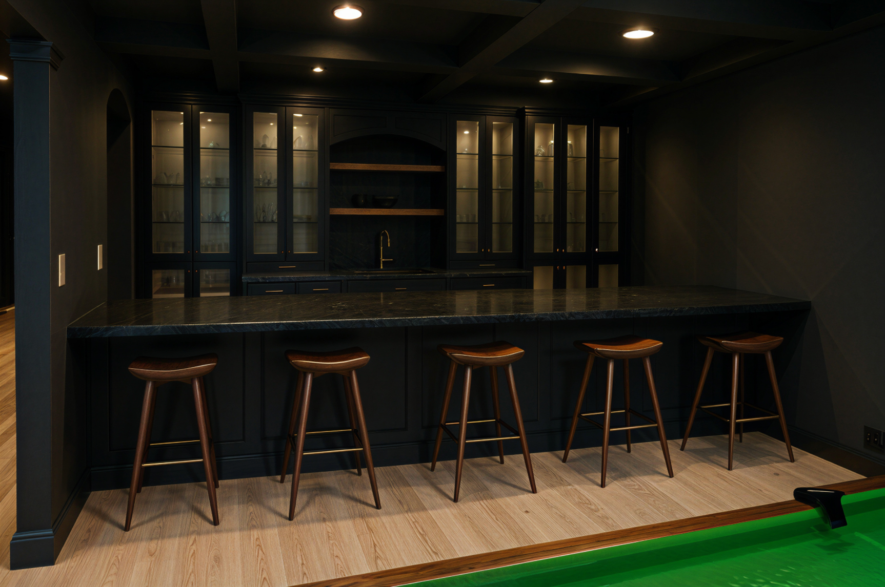 darken the floor color and remove the glass from the cabinets on the edges