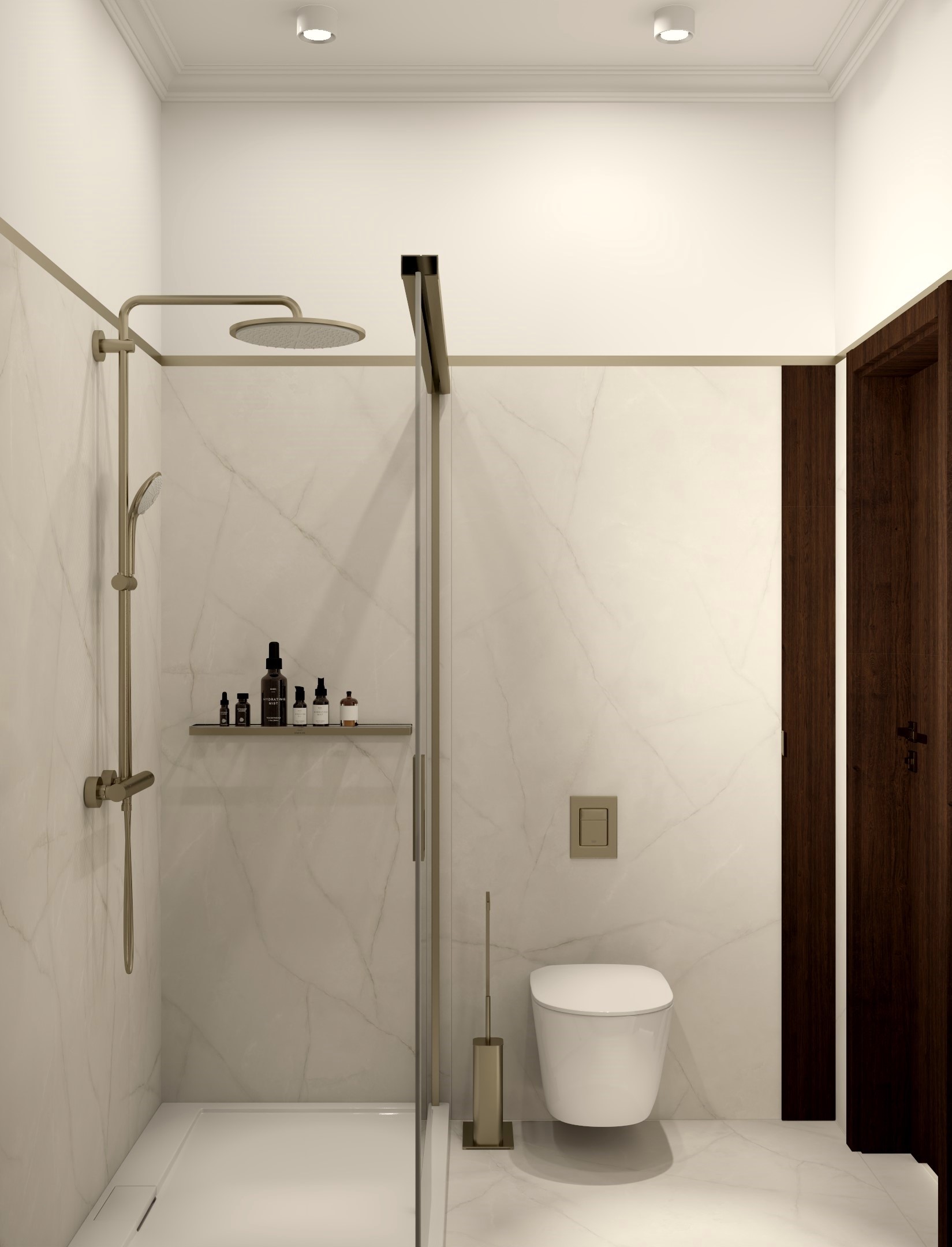 render a classic minimalist bathroom in paris style with an elegant and sleek design walls are clad in light beige marble with subtle veining the shower area features brushed gold fixtures including a rain shower head and hand held shower creating a luxurious feel a clear glass partition separates the shower from the rest of the room the floor is a continuation of the light marble with fine veins bringing a seamless continuity the shelving holds stylish black and white bottles adding contrast a white wall mounted toilet sits adjacent to the shower complemented by a matching brushed gold flush panel and toilet brush the wooden door has a rich dark brown tone providing warmth to the space ceiling lights cast a soft inviting glow enhancing the serene and tranquil atmosphere