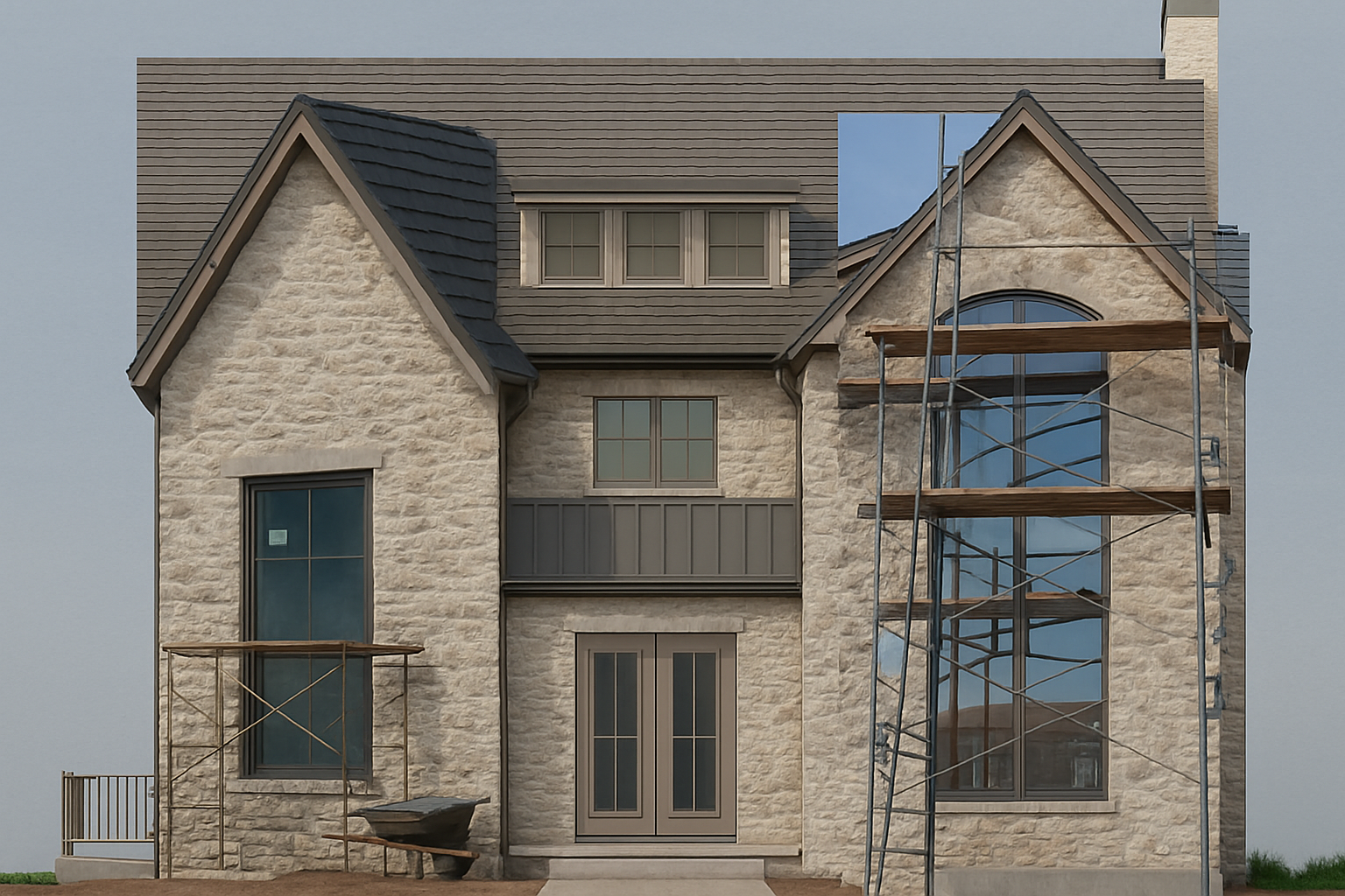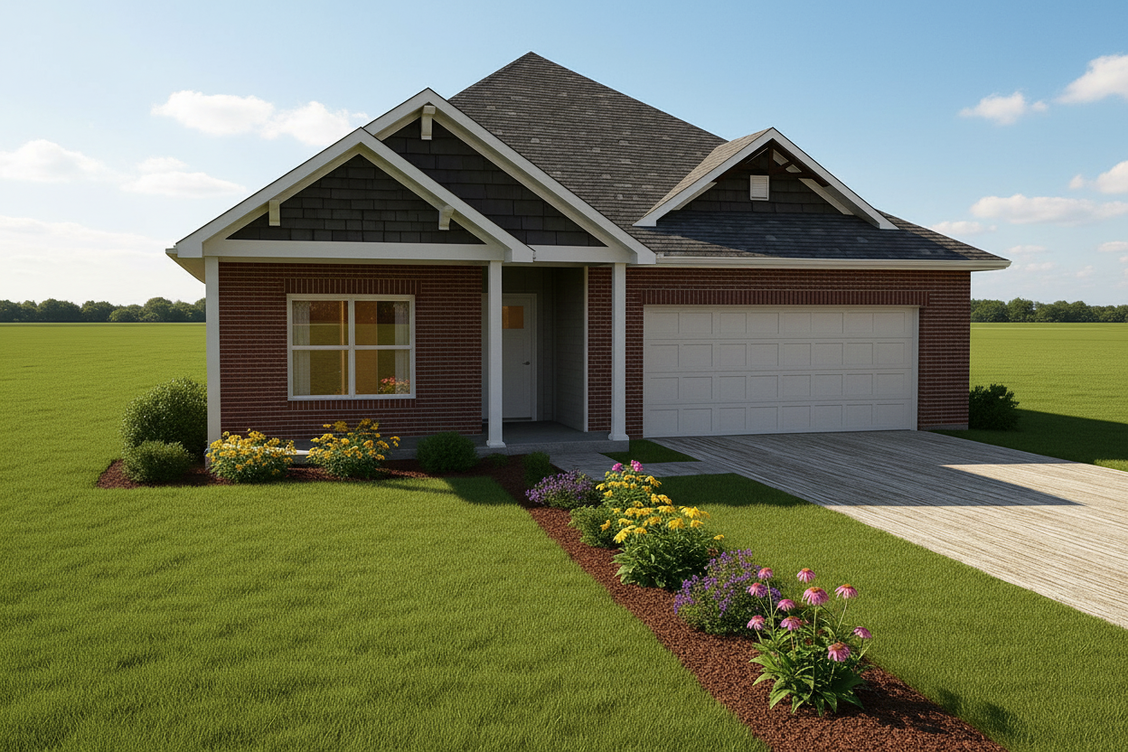 two story office building dark reflective windows with dark frames white exterior walls building is 150 wide and 75 deep there is a 34 x28 covered drop off on the right side of the building make the covered drop off area all black front of the building should be all nice landscaping with mature trees in the foreground and background a slight perspective view would be preferred tower on the right side of the building is 10 x22 right side of the building has the same window pattern as the front there is no paving at the front of the building there is a parking lot behind the building and to the right of the building front should be all lush landscaping