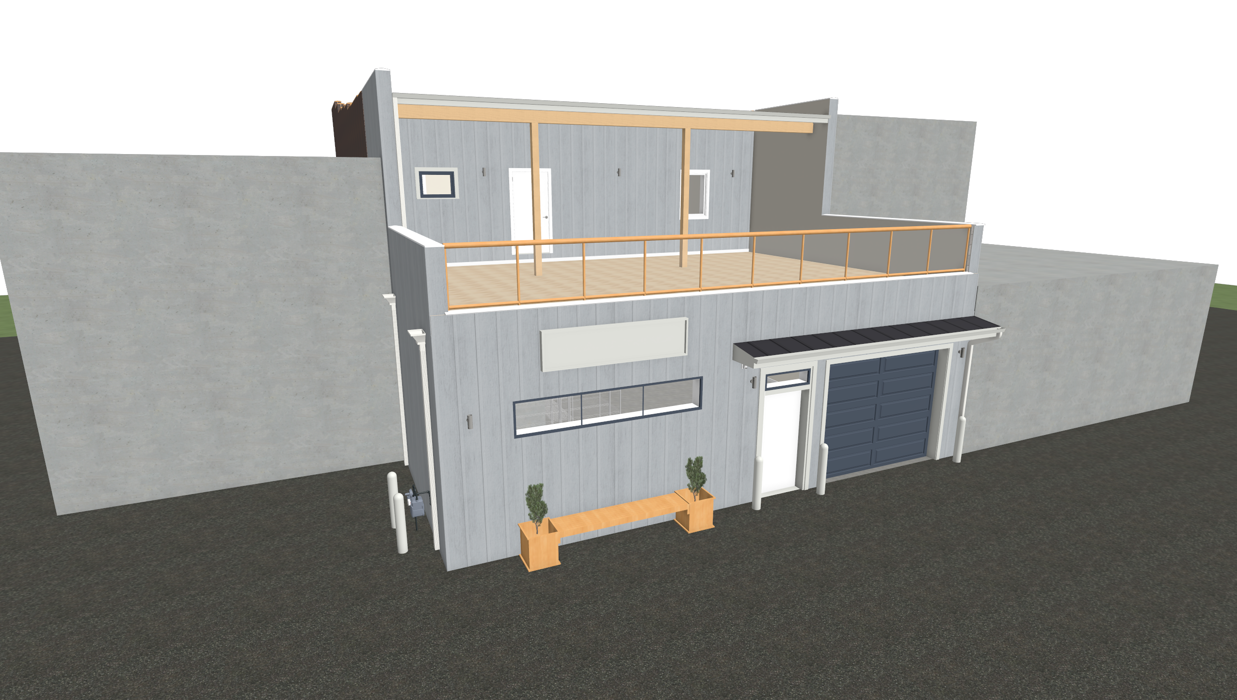 dont change location or size of windows and doors siding stay the same color but change the material to ribbed steel windows and doors to be a darker color buildings on left and right to be white in color background to be a small town setting