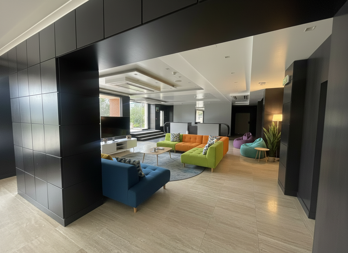 black smoked mirror wall in back corner maintain color on drop ceiling