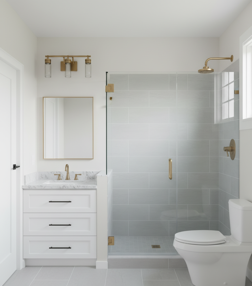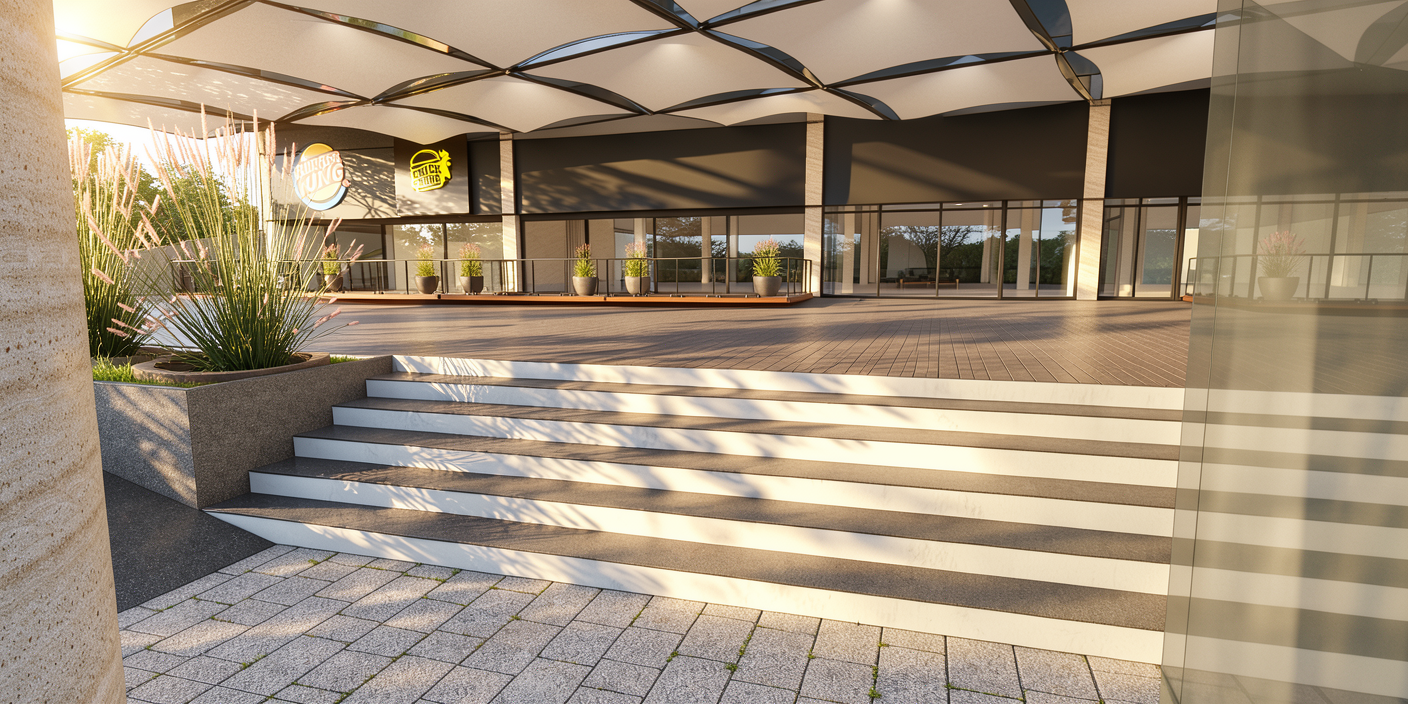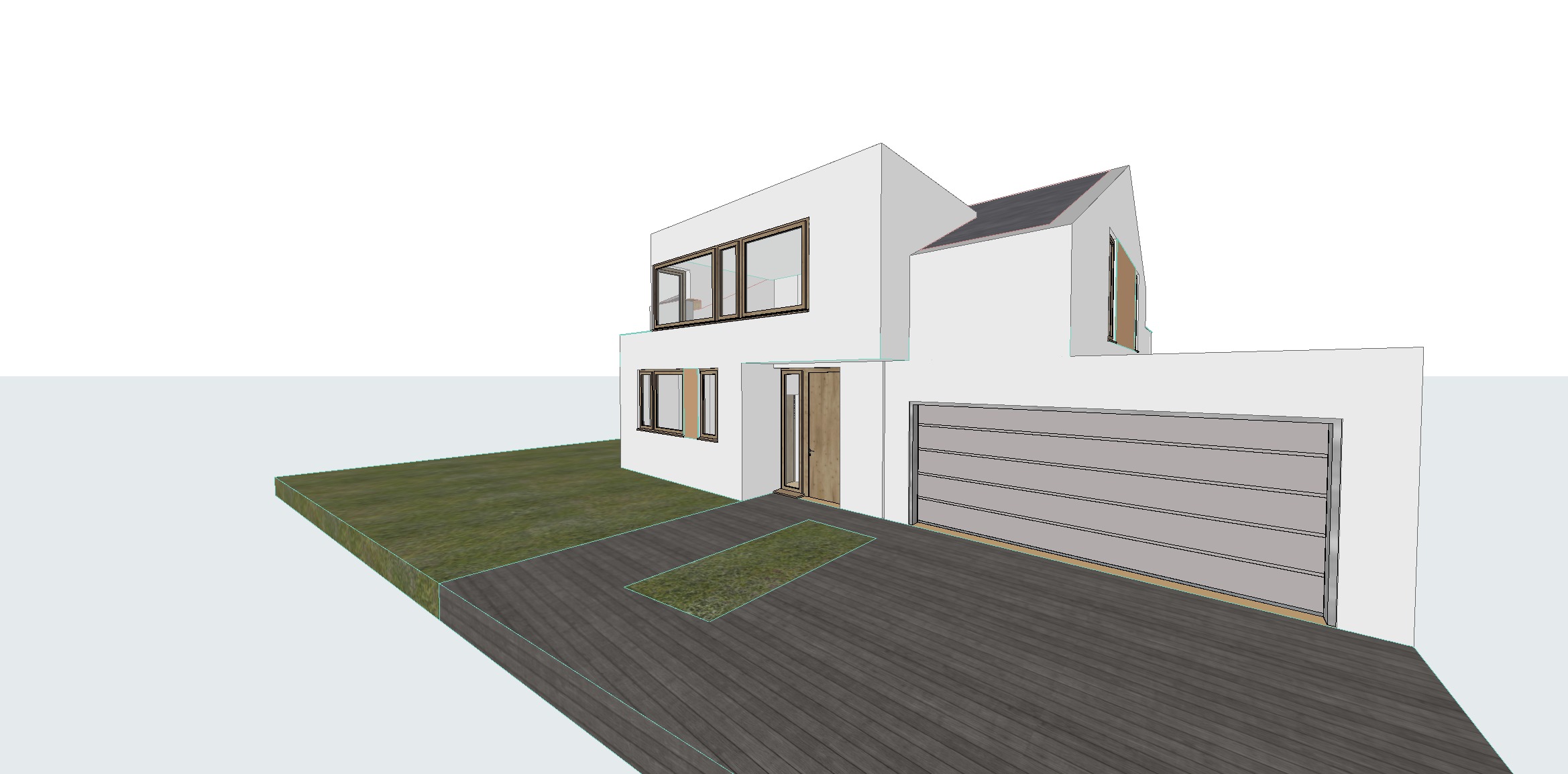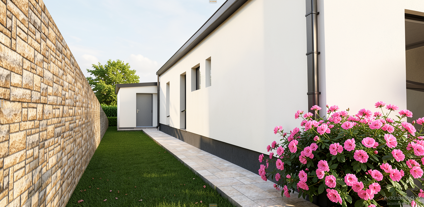 rechts und links moderne eingeschossige bebauung mit satteldach an der grenzen hecke