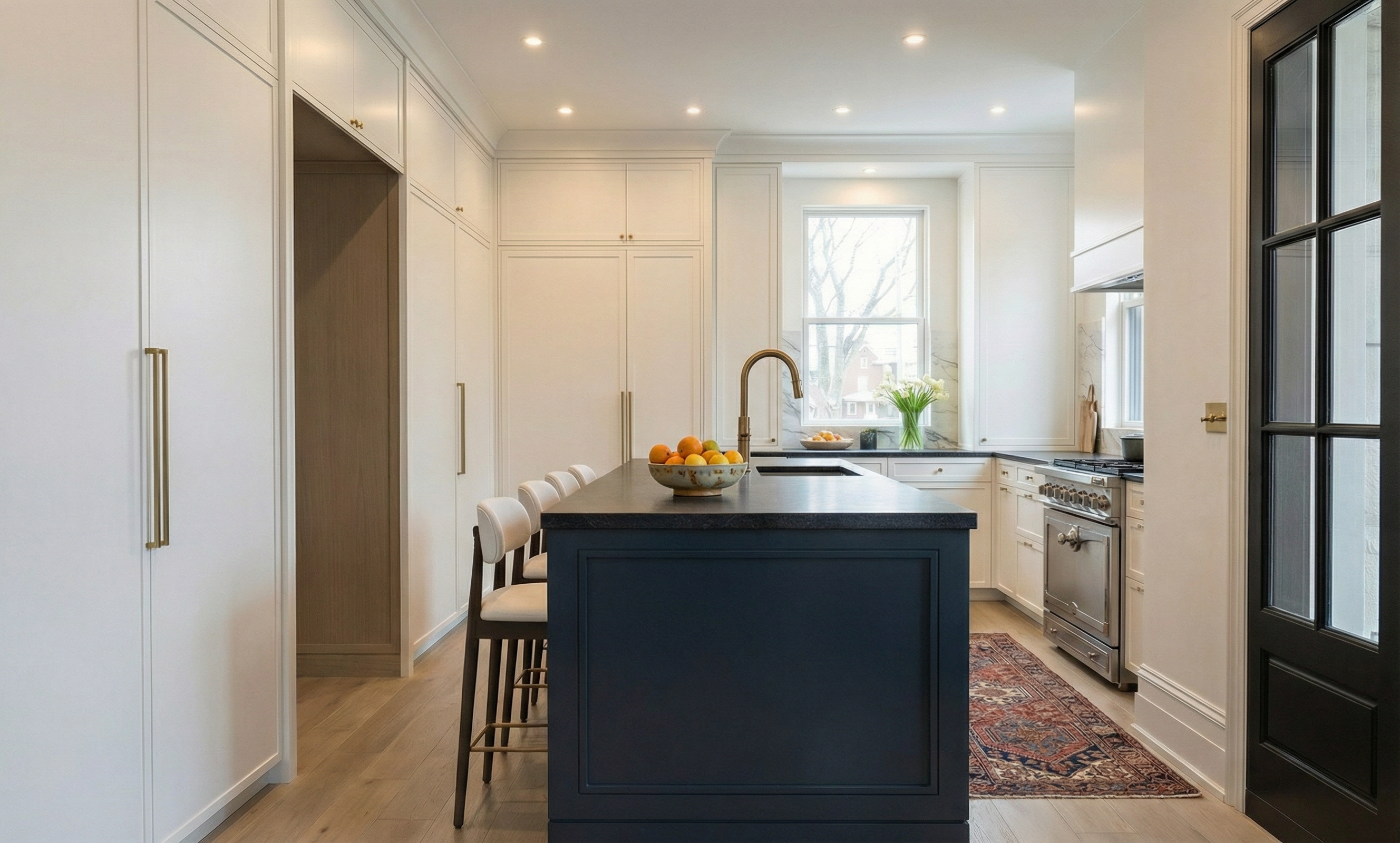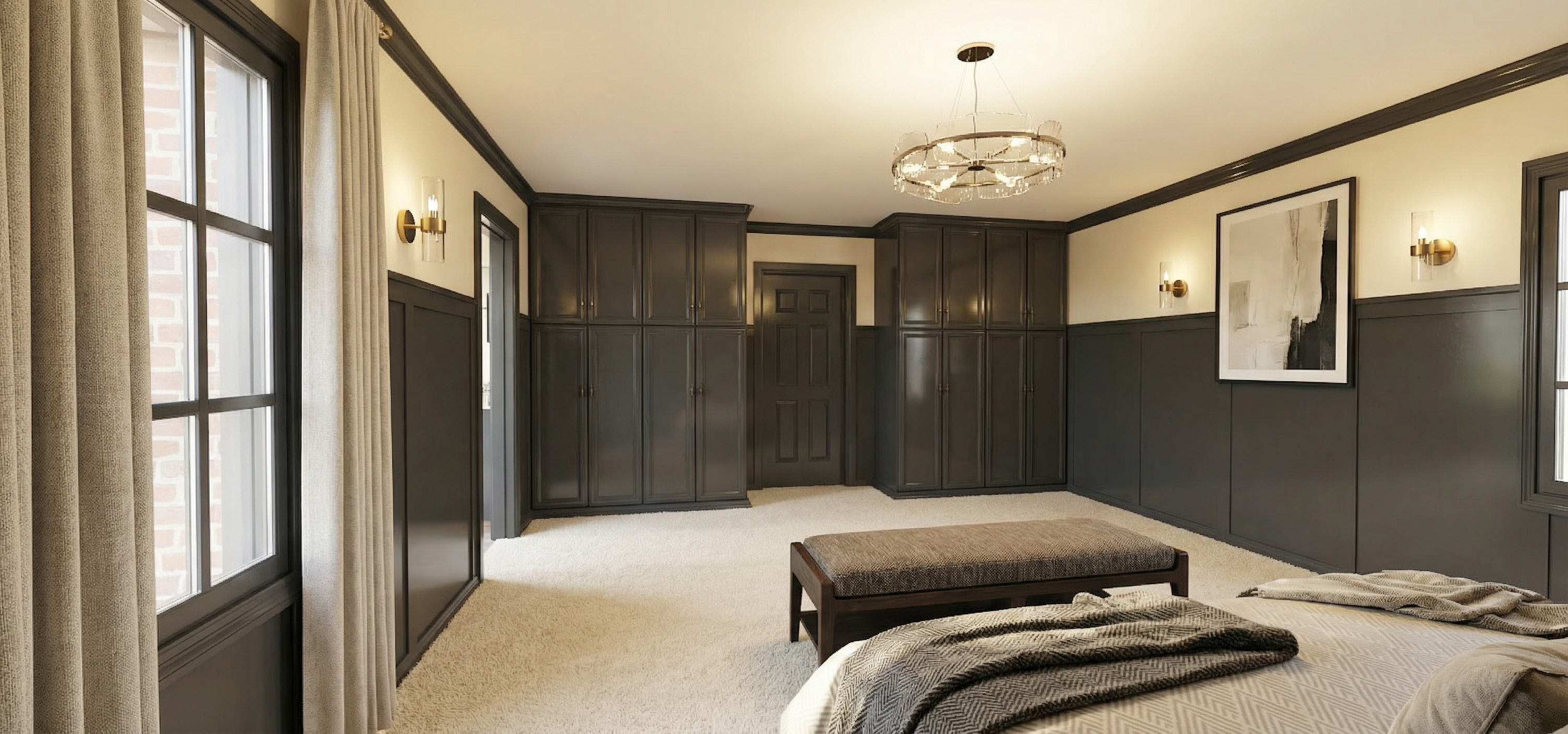 render a modern interior with a high ceiling and glass railings creating an open airy atmosphere the floor is a light wood tone providing warmth the walls are crisp white for a clean minimalistic look a black office chair and a sleek beige sofa add contrast in the space the central column is dark grey adding a bold focal point while the bookshelf is black and filled with neatly arranged white and grey books soft natural light floods the room from large windows enhancing the calming and spacious feel the cabinet doors are made of black glass and all the shelves are filled with books and led lighting