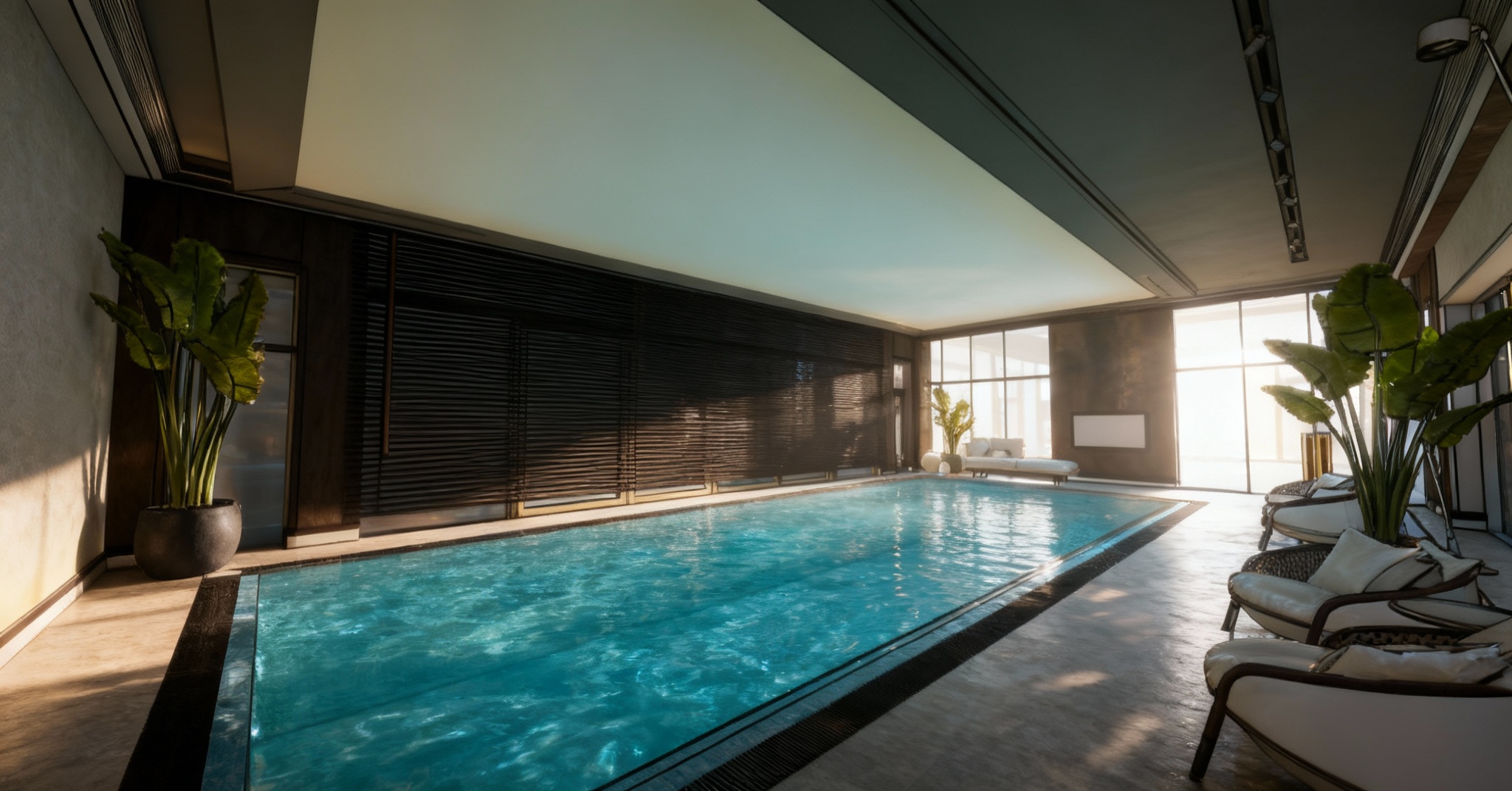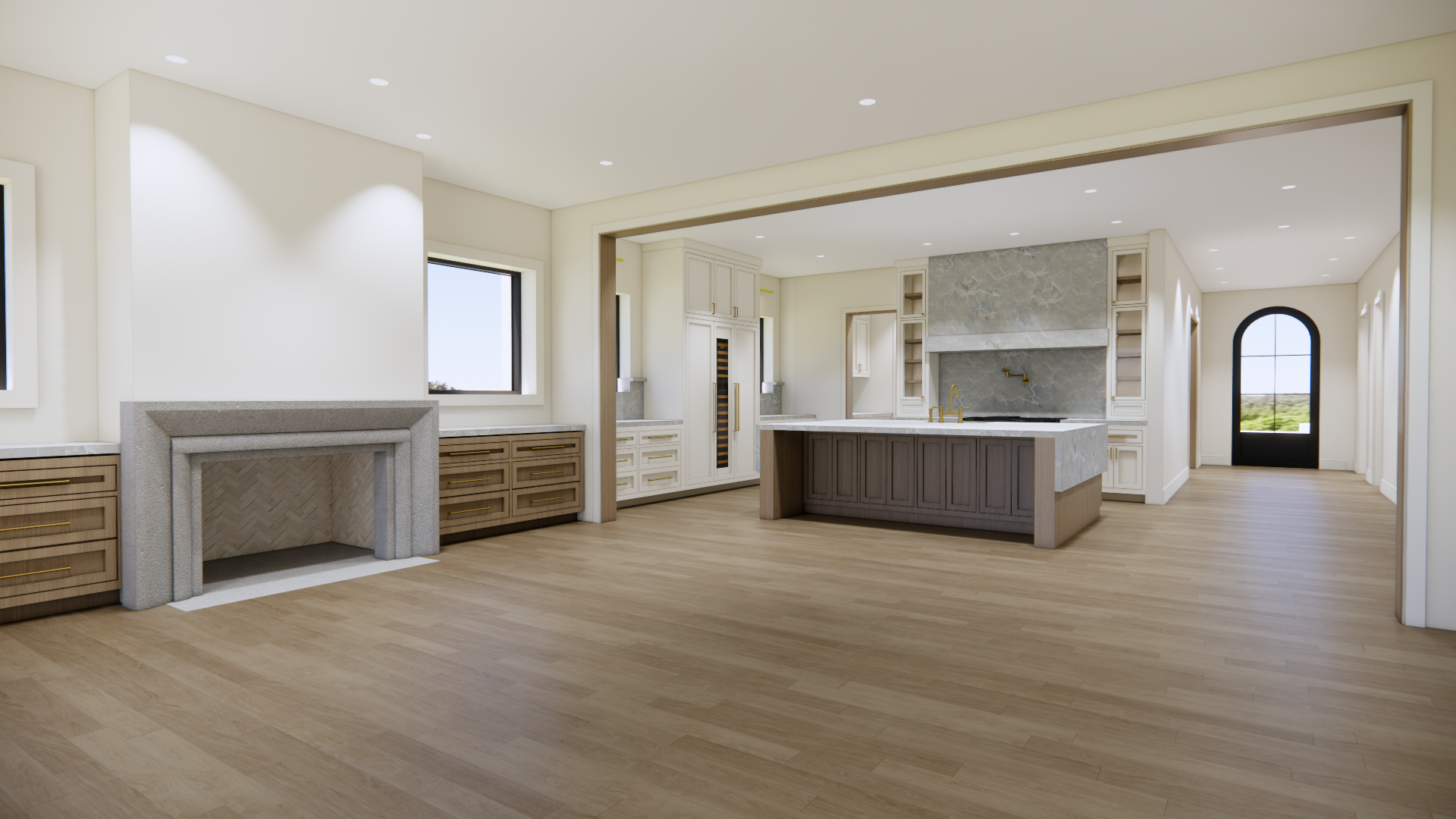 ultra photorealistic cinematic rendering of a kitchen inside a luxury transitional home natural midday sunlight with soft shadows and bright ambient lighting realistic reflections on marble glass and metal surfaces pbr wood grain texture detail with fine anisotropy leica 35mm full frame aesthetic with shallow depth of field editorial color palette warm whites rich walnut wood and soft daylight neutrals balanced highlights natural contrast and soft reflections for a refined architectural digest style composition