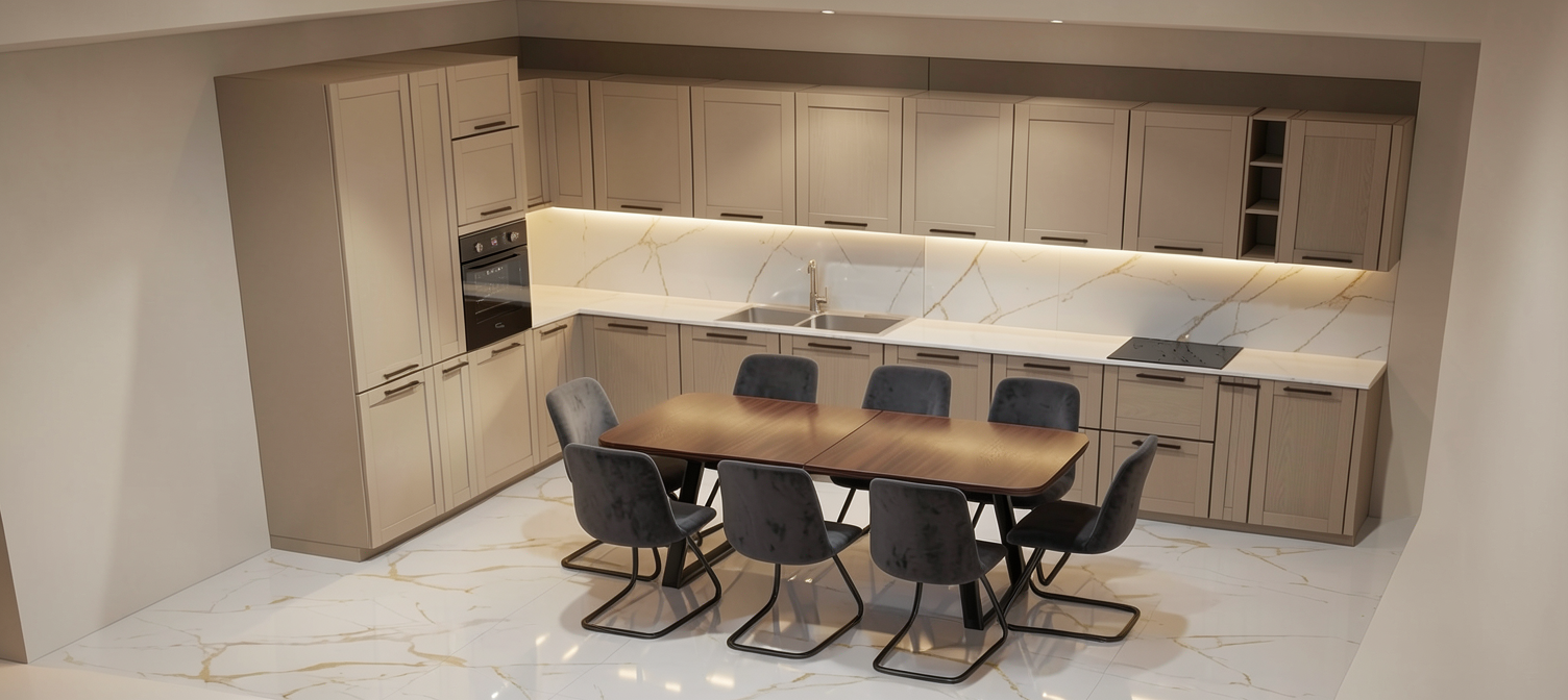 please change just the color of the wall units to white and change fronts of the 2 wall units above the sink to glass fronts satin color