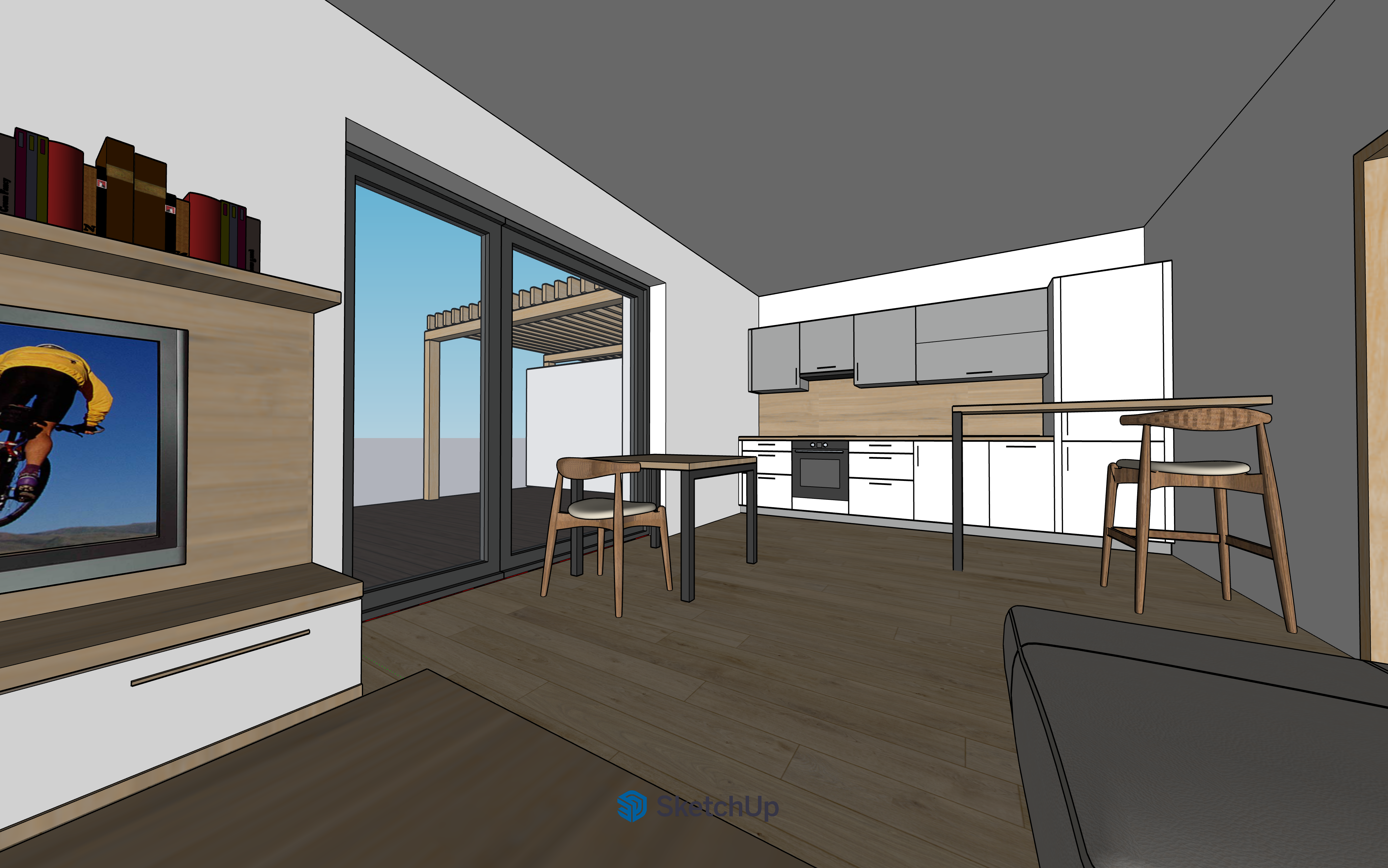 interior shot modern interior design open living room and kitchen stylish conference and minimalist furniture wooden table with black metal base and dining set anthracite gray sofa light oak floor with slight emphasis on floor slats large glass doors with subtle blue reflections white walls and ceiling warm ambient lighting soft shadows books on a wooden shelf realistic texture on the tv screen showing a vivid natural scenery in the background a dining table with a black metal base and wooden chair a bar table with a black leg on one side anchored to the wall on the other with wooden chair of the same design and a view of the kitchen at the back a kitchen with white glossy doors a 5 cm wide dividing strip on the sides next to the stove on both sides 3 drawers shallow at the top deep at the bottom the upper cabinets are gray next to the tall cabinet there is a wide cabinet with flap doors above the stove there is a cabinet with a strip hood the wall between the upper and lower cabinets is covered with a wooden board in an oak pattern the worktop in the same pattern