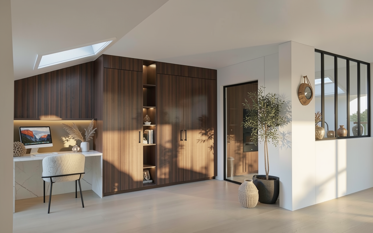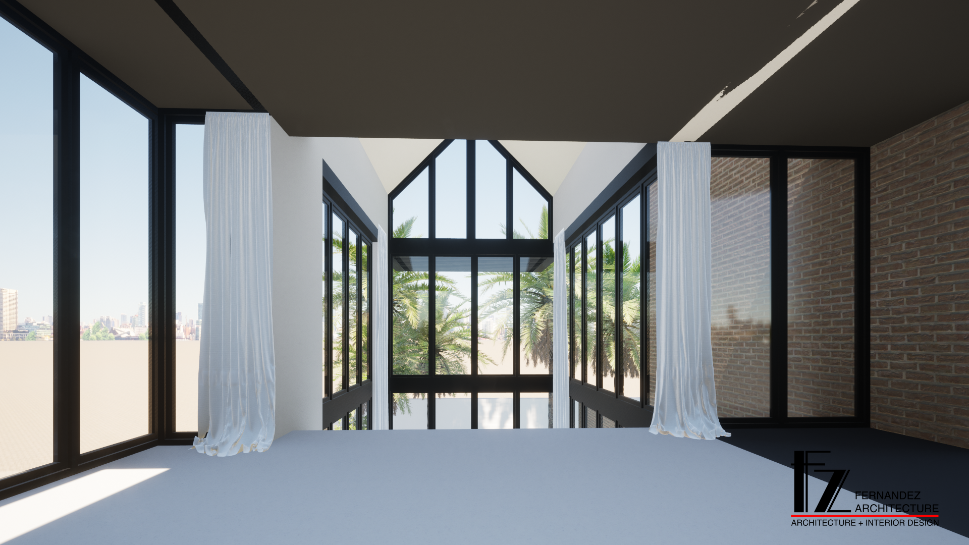 elimina el logo respeta la perspectiva el fondo pertenece a un espacio de una planta por debajo donde se situa el salon esta habitaci n se separa del espacio de abajo a la altura de las cortinas por una pared de vidrio de suelo a techo coloca la cama mirando al fondo y coloca plantas tropicales en el patio exterior
