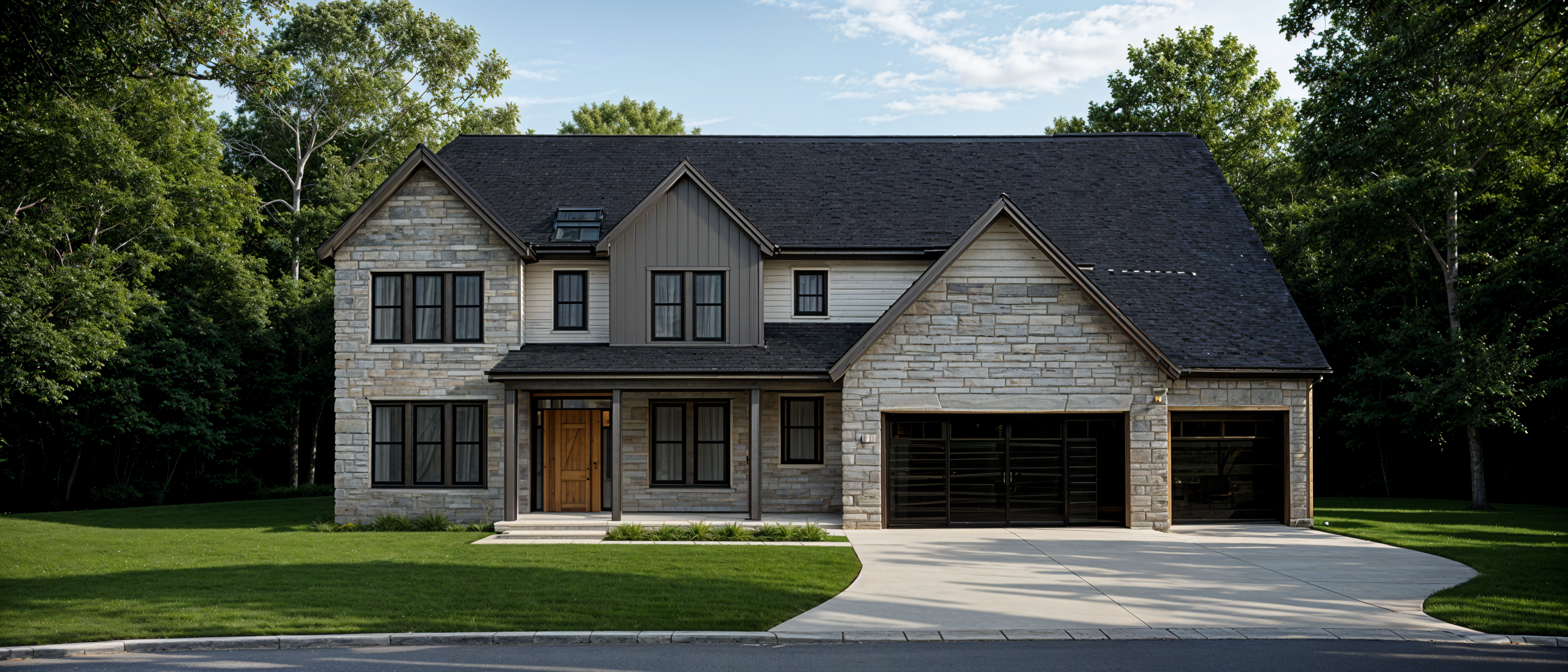 keep everything the same but make the garage door color the same as the siding color and make the stone white and remove the window above the garage