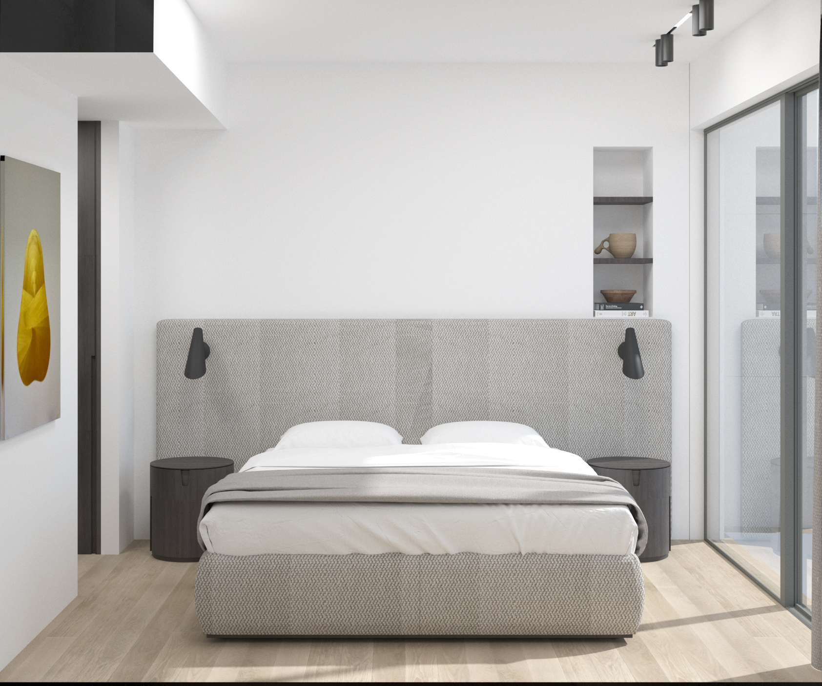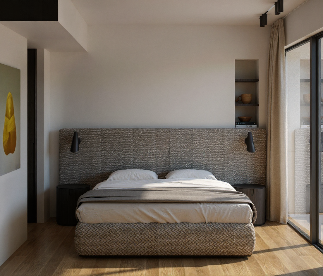 realistic render warm tones natural light curtain in the window ight from the wall lightsand change the fabric in the bed wall