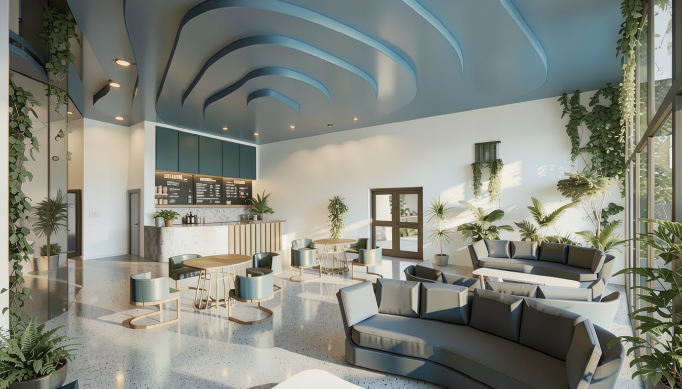 make the walls in the back white add a dark blue color ontop of the menu leave the ceiling a dark blue