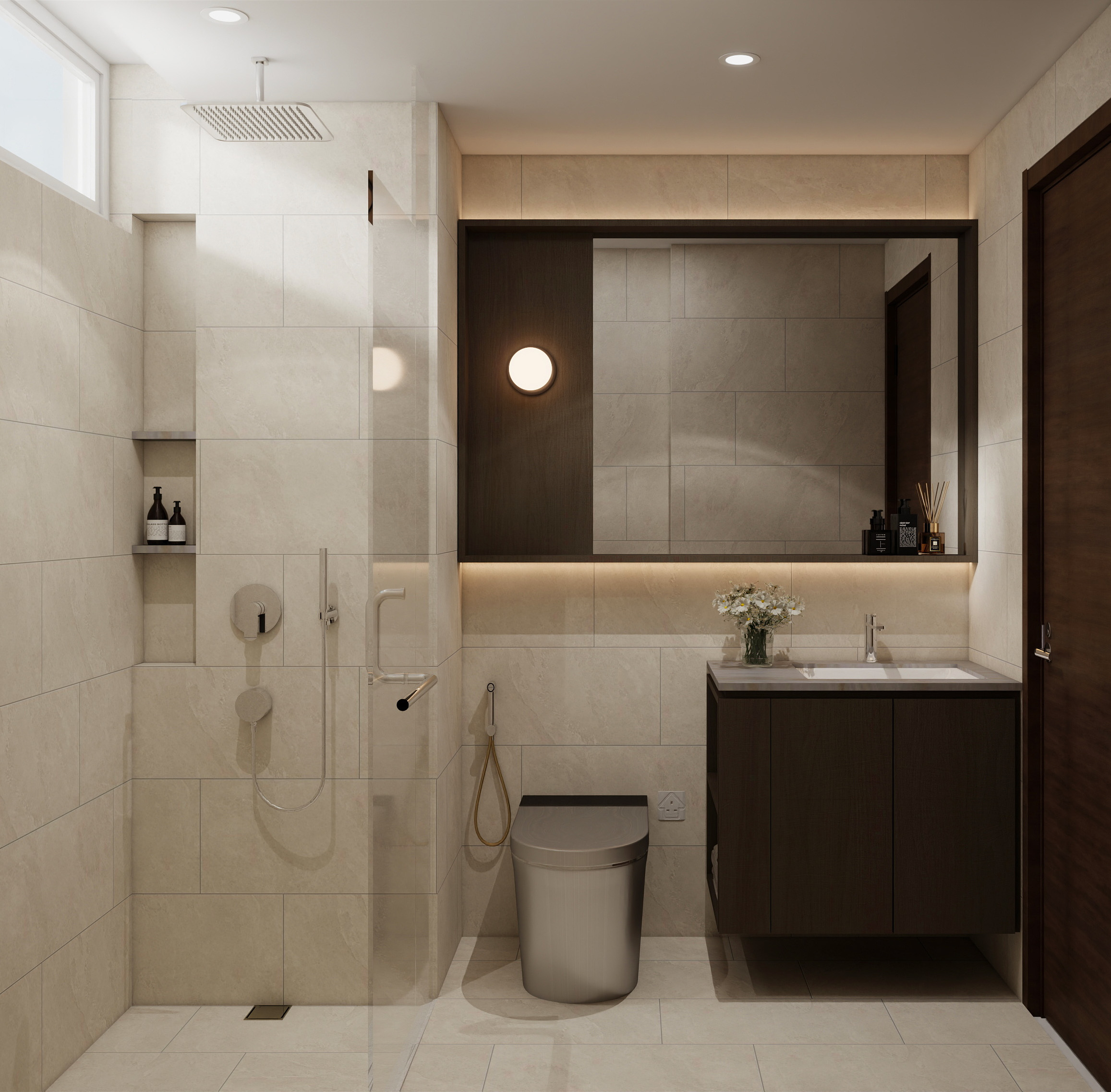 the powder room to be classier with more design flair but no colour play change toilet bowl to white remove bidet remove rain shower redesign the sink vanity and mirror to be more elegant for a guest bathroom wall tiles stay the same
