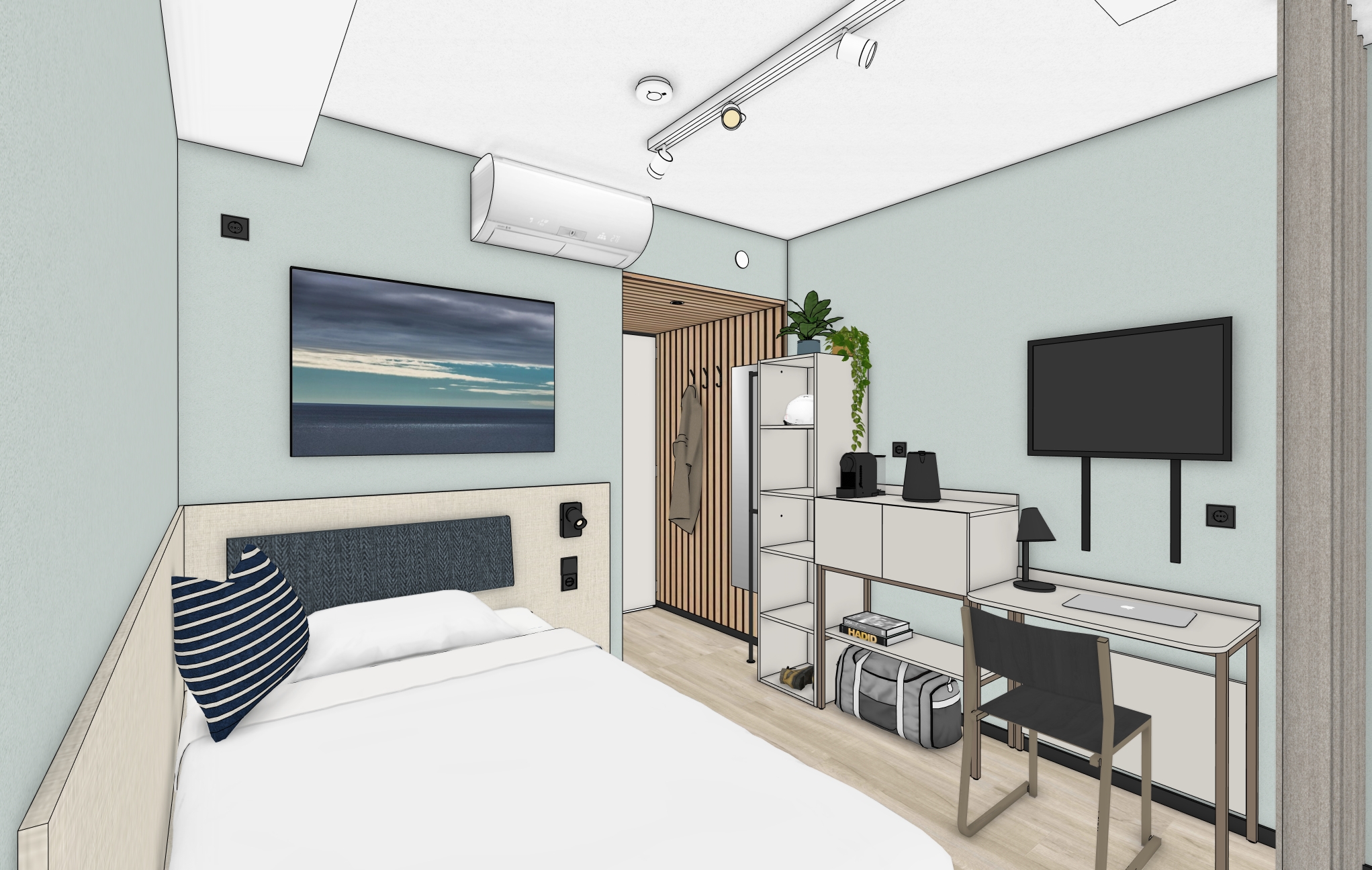 headboard of the bed is is egger textiel beige natural diffuse daylight from behind