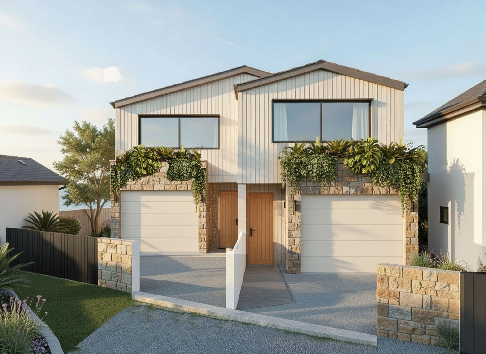 change the driveway to limestone cobblestones make the garage doors vertical timber battens