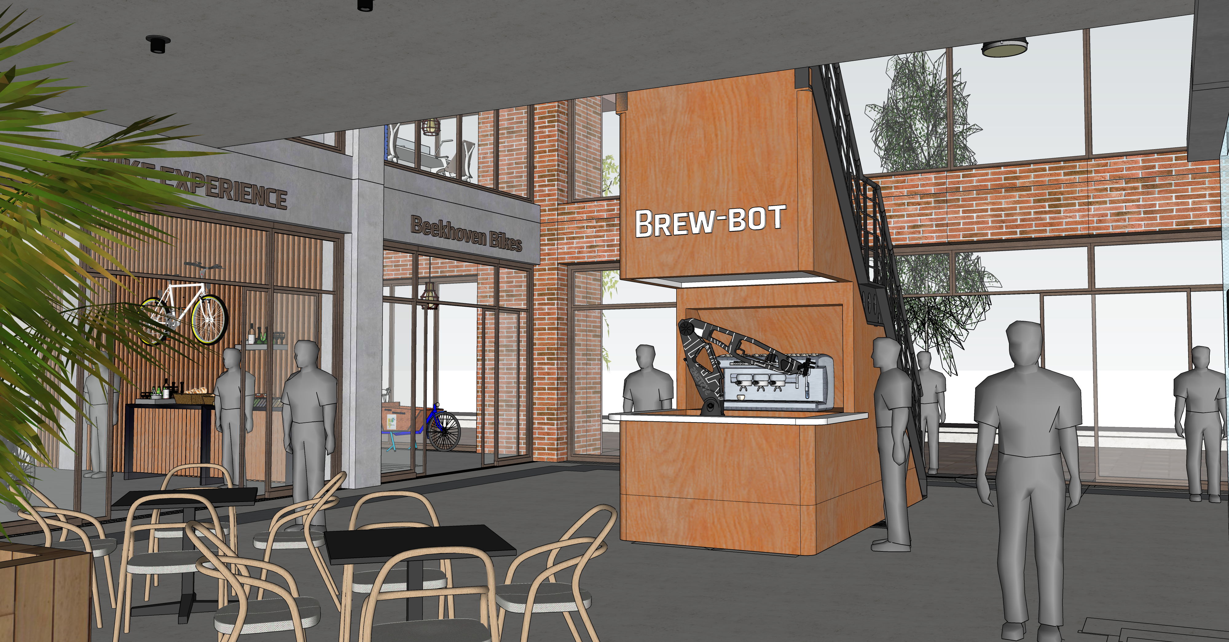 modernist interior shot industrial coworking space wooden details white walls concrete floor light ambience architecture