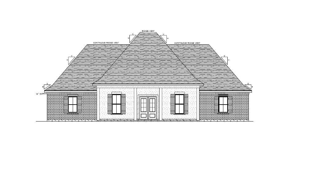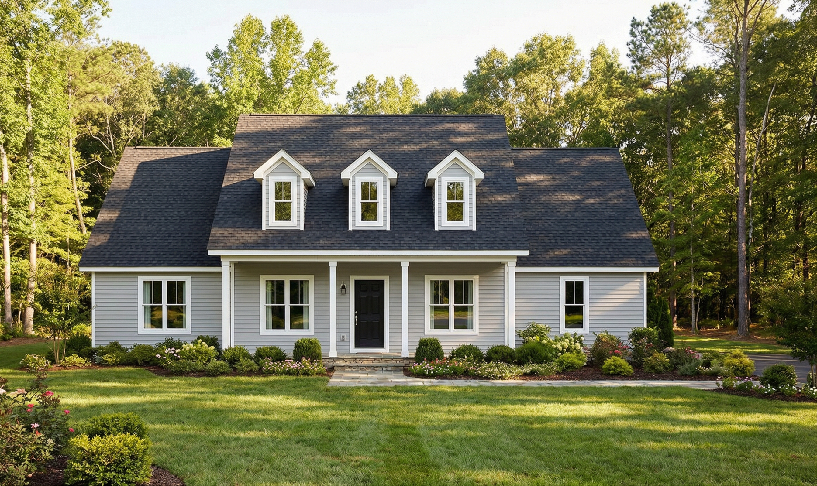 make as photorealistic as possible while keeping textures the same as selection professional landscaping in a lightly wooded scene with good lighting match materials to plan and remove any text black trim windows white painted stucco brown aged brick cypress porch posts