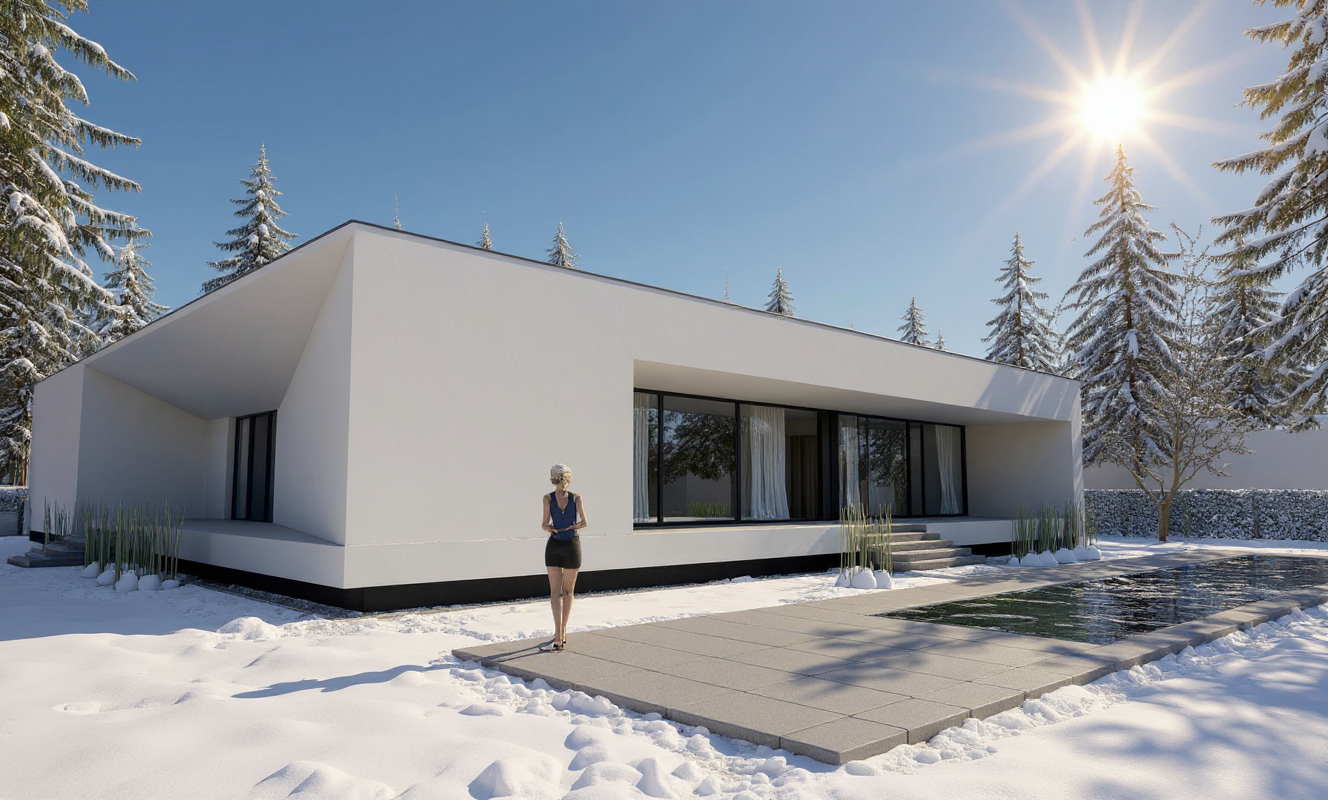 winter with snow add tree add more trees and more ornamental shrubs and more pines more sun show swimming pool
