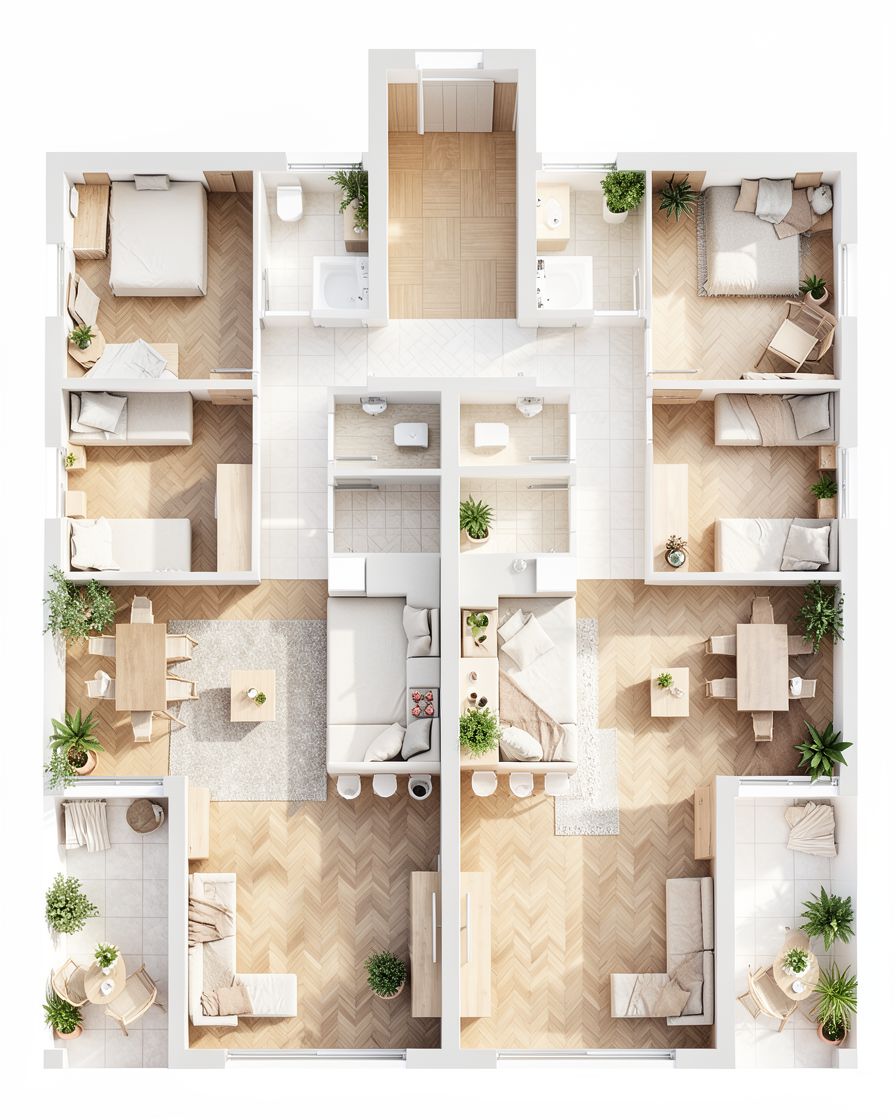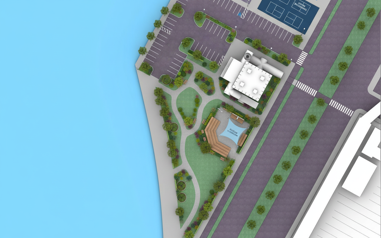 do not change any existing geometry create an architectural plan drawing of the site around my building the light blue color that is on the left hand side of the image is meant to be water in the form a river the building is the white square with the white rectangles around it do not change the building in any way the dark blue rectangle in the top right corner needs to be some existing pickleball courts that run the length of the rectangle the gray area in between the building and the pickleball courts needs to be a parking lot add any landscaping to make the parking lot look appealing the purple material is meant to be the asphalt of the street and needs to connect to the parking lot the green areas are medians in between the road where there needs to be some trees and other plants the remaining central gray portion needs to be turned into a cool park with an outdoor classroom do not change the shape of the shoreline in between the water and the gray