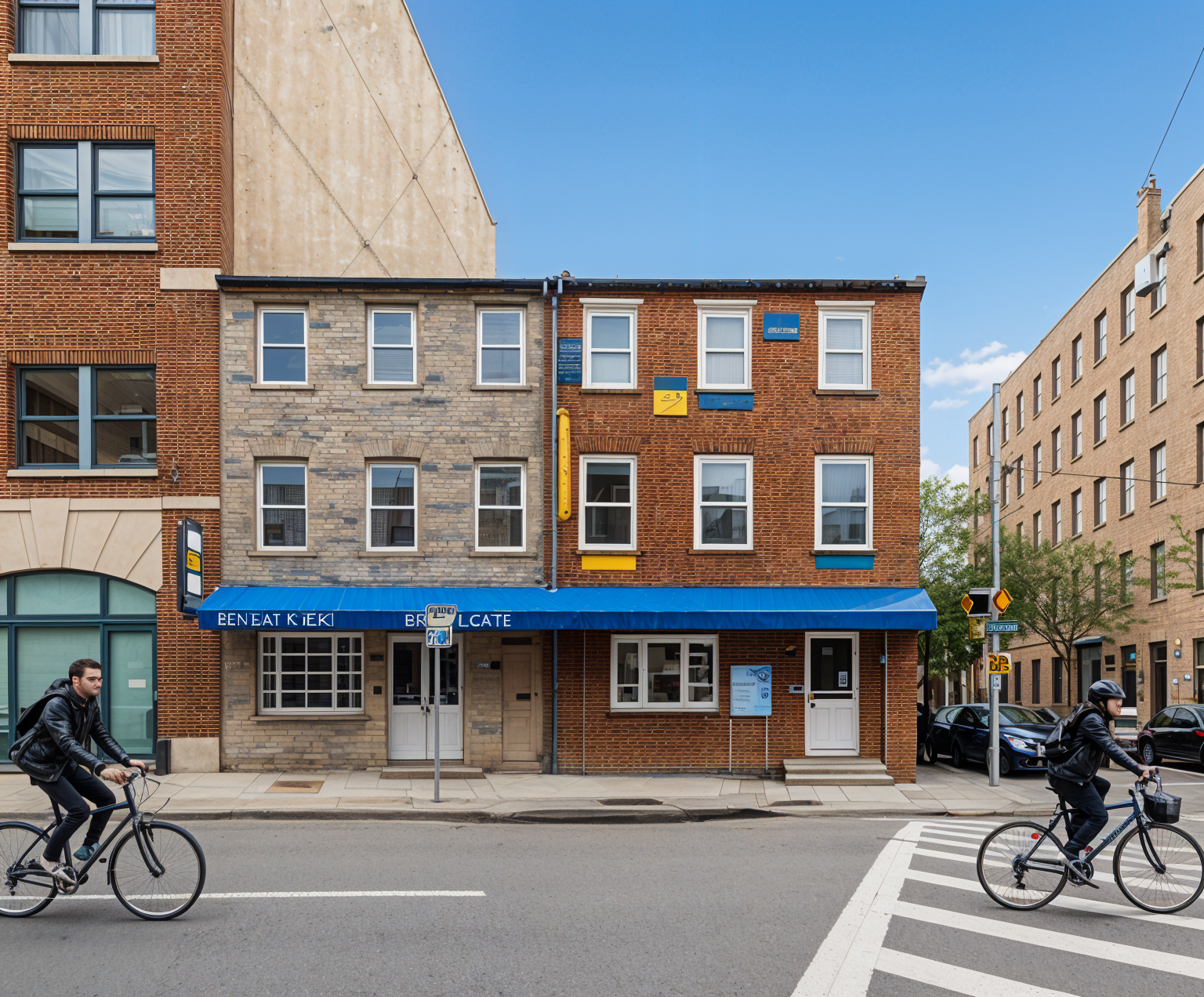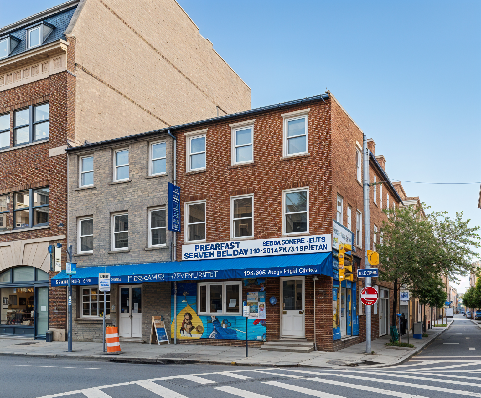 redesign the facade of these two buildings so that it looks more like one building and add two more floors on top the resulting building is 5 stories tall keep the original character of the buildings in the new design make the new design extremely beautiful and make it look as if the buildings have been combined into one dont make the resulting building wider though architecture
