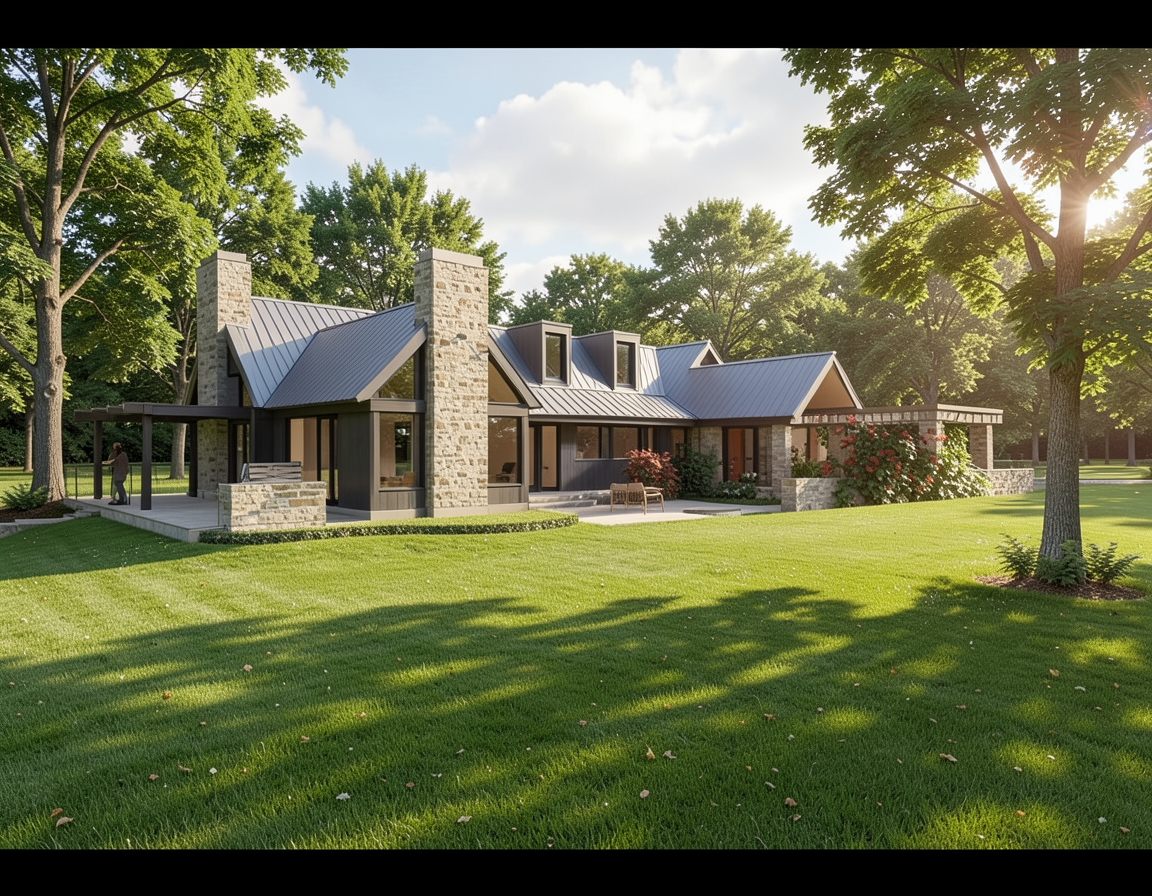 photorealistic outdoor of a new beige building with grass and modern plants tress on the background warm tones add a concrete path on the grass