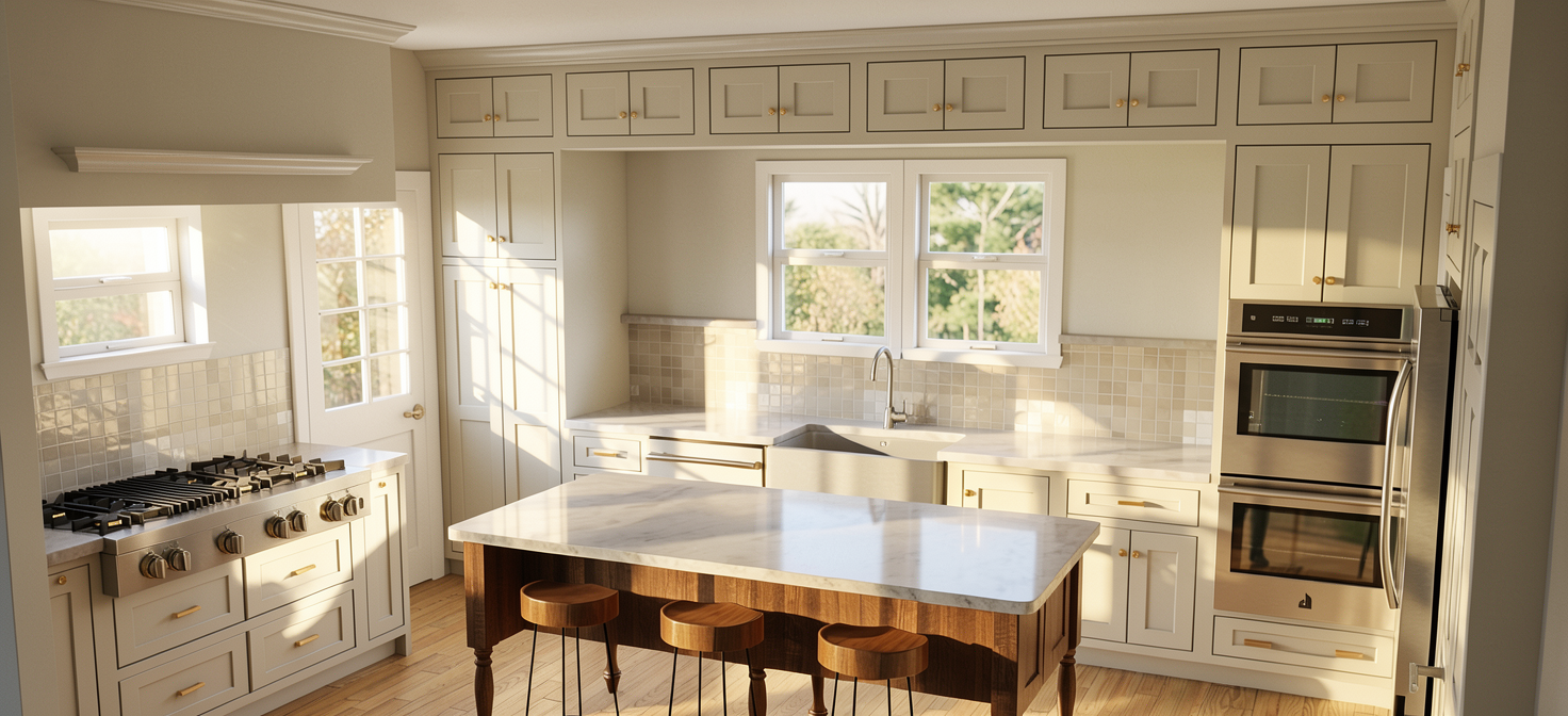 design me an 8ft bar with green marble counter dark green backsplash tile and led lights make a central upper cabinet with open shelves on either sides of the upper cabinet