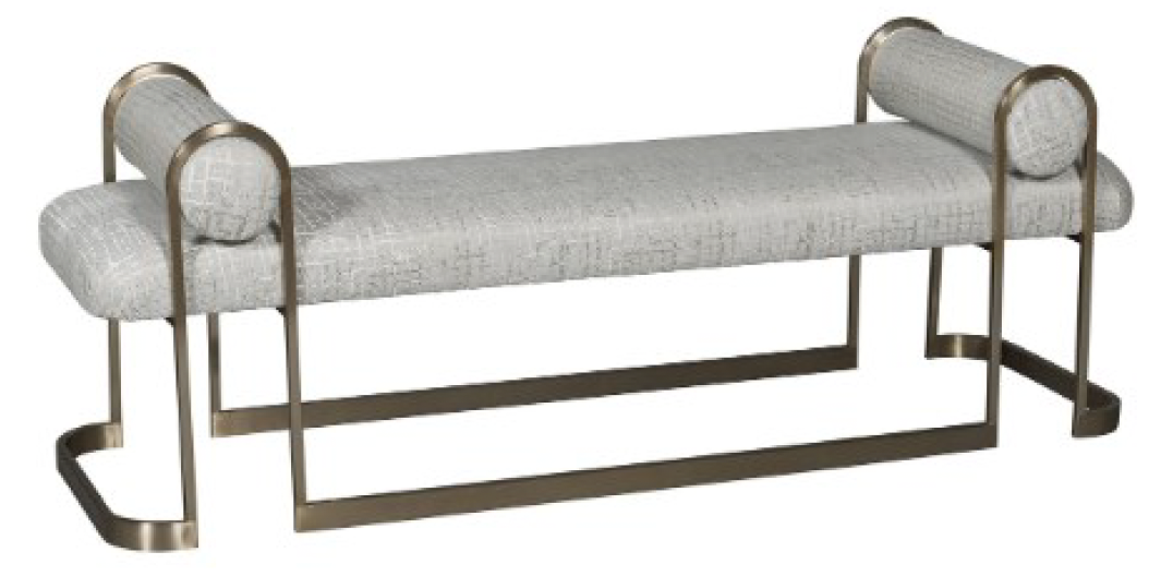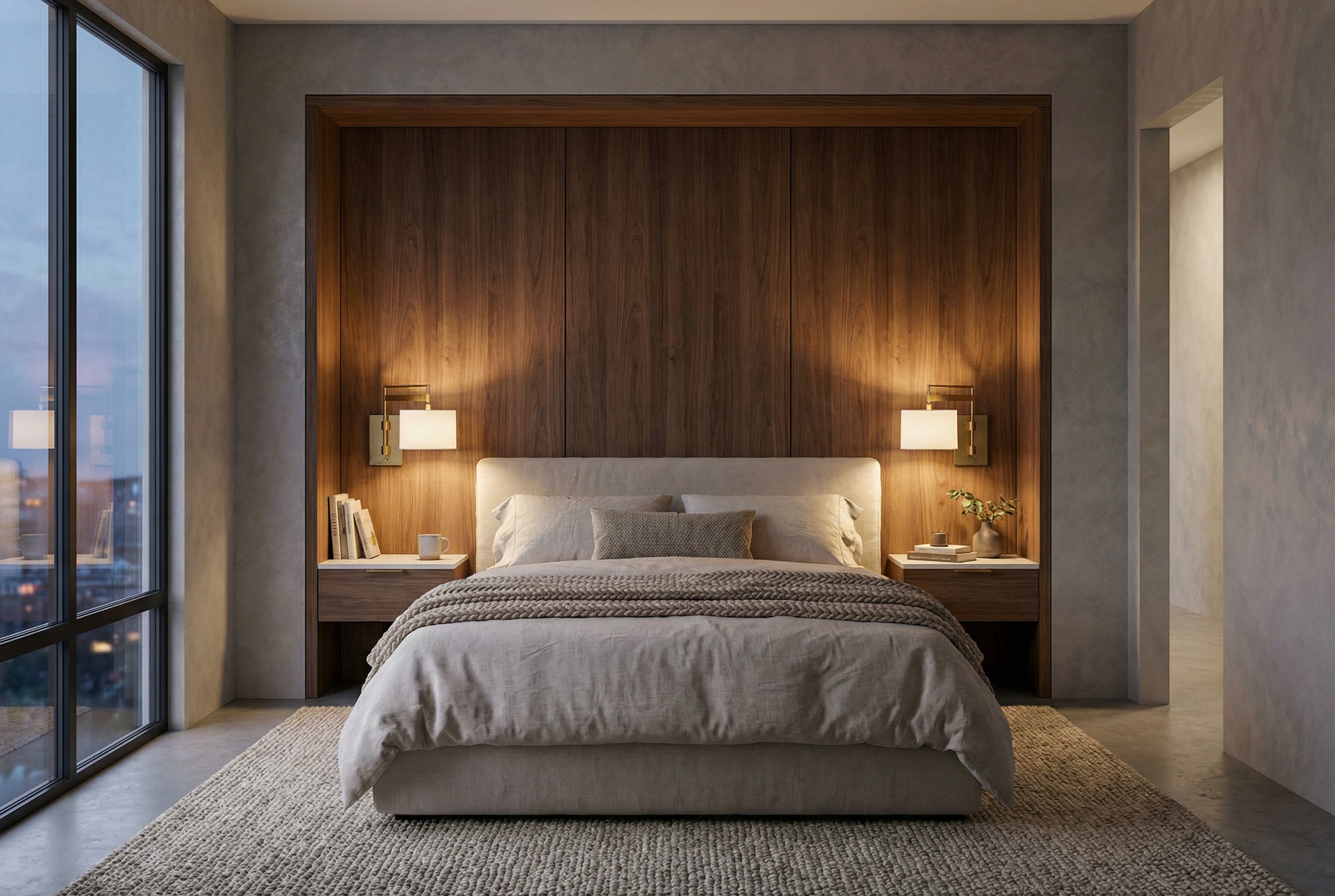 exterior shot add bench at end of bed based on reference image add 7 tall baseboards and downlights in ceiling show closed stained door on right side of image