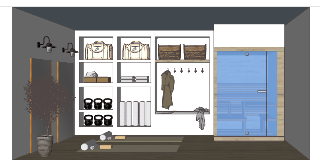 genera un espacio interior destinado a zona wellness gimnasio dom stico o espacio de relajaci n inspirado en una est tica c lida y natural el espacio es una estancia amplia y luminosa con abundante entrada de luz natural que potencia la calidez de los materiales y la atm sfera de bienestar utiliza los siguientes materiales y acabados paredes acabadas con microcemento o estuco en tono arena o beige c lido con textura suave y homog nea que aporte calidez y una sensaci n terrosa suelo tarima de madera clara con vetas suaves preferiblemente en roble blanqueado o natural con acabado mate alfombras coloca alfombras de fibras naturales como yute o sisal con tonos marrones dorados y textura rugosa alineadas en paralelo sobre el suelo de madera equipamiento incluye una bicicleta est tica negra con asiento en tono mostaza o cuero natural pesas de mano negras colocadas sobre las alfombras y anillas de entrenamiento o cintas el sticas colgadas del techo o de una barra mobiliario banco corrido de madera clara tipo roble con estanter as inferiores cojines en lino beige o blanco roto y toallas o libros decorativos colocados cuidadosamente decoraci n a ade elementos cer micos en barro cocido o arcilla jarrones grandes l mparas decorativas de suelo usa iluminaci n c lida e indirecta l mparas de suelo de mimbre o faroles con luz suave y acogedora integra plantas de interior en maceteros de barro o fibras naturales para aportar un toque verde y org nico elementos arquitect nicos clave lado izquierdo coloca dos espejos verticales de gran formato sin marco o con marco m nimo que reflejen la profundidad del espacio y amplifiquen la sensaci n de amplitud lado derecho integra una sauna construida en madera clara perfectamente alineada con el dise o del banco y el resto del mobiliario debe transmitir calidez funcionalidad y coherencia con el conjunto del espacio el ambiente general debe transmitir calma equilibrio y bienestar el estilo es contempor neo con influencia mediterr nea terrosa utilizando una paleta monocrom tica de tonos arena madera natural y materiales org nicos la luz natural debe jugar un papel protagonista en el dise o del render resaltando vol menes texturas y tonalidades c lidas