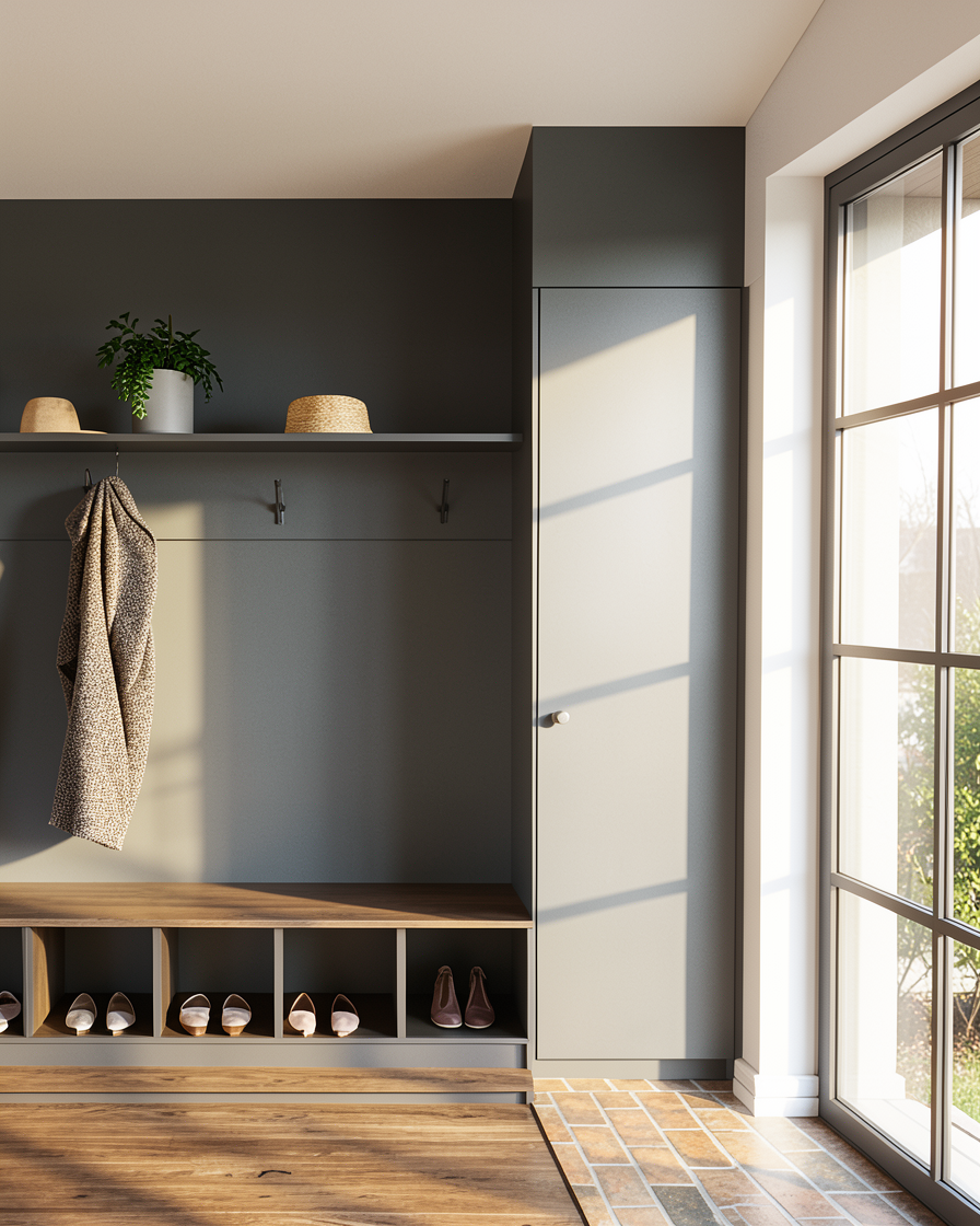 make photo like remove the step at the botton of the shoe cabinet make the brick flooring look more real