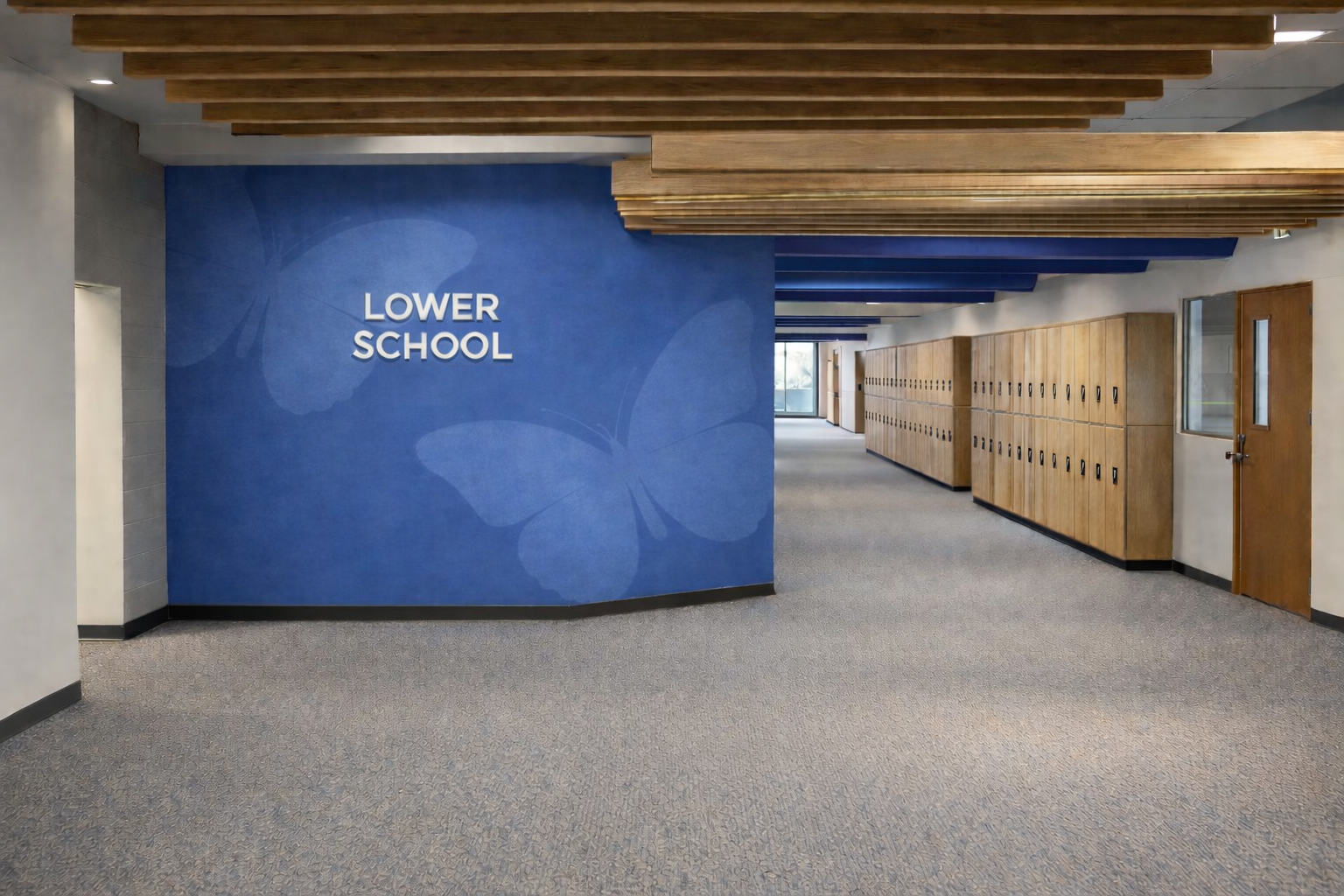 add grey carpet tiles to the floor lights in the wood slat ceiling the words lower school on the blue wall add large faint blue butterflys to the blue wall take the butterfys off the wall on the right