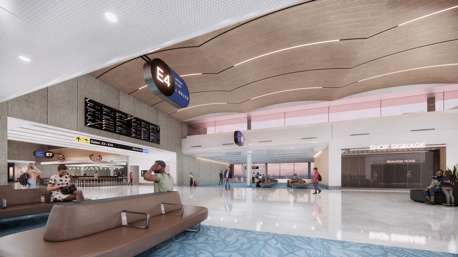 don t change the camera angle no direct sunlight in the space add hawaii ocean no corals but abstract fish themed elegant mosaic art on the fascia this mosaic art is made of white beige champagne and light blue tiles fill the shops with souvenir shops don t change the gate lounge on the left add cove light on the ceiling remove pinkish sky light behind the glass change the shop sign to aloha mart change the flight information board on the left to digital art