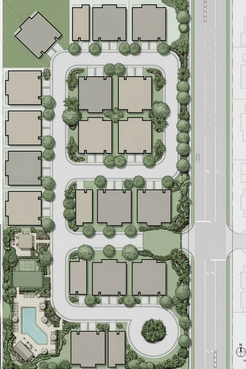 create a site plan for this gated community add lush landscaping and make it look inviting no text or key on the right side of the site plan is a main road