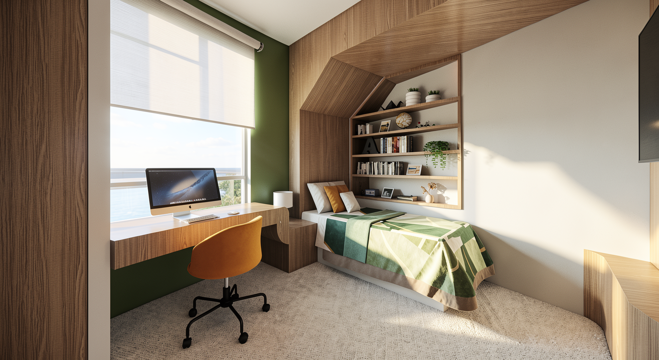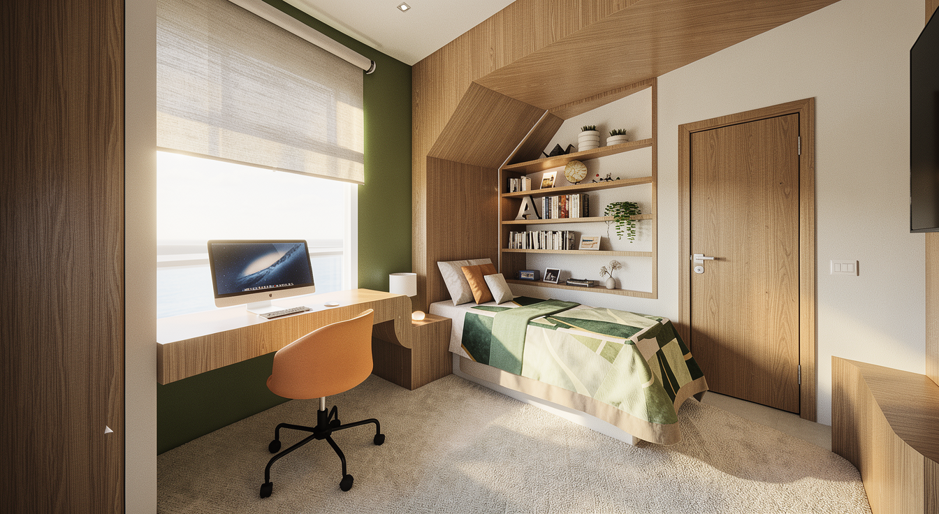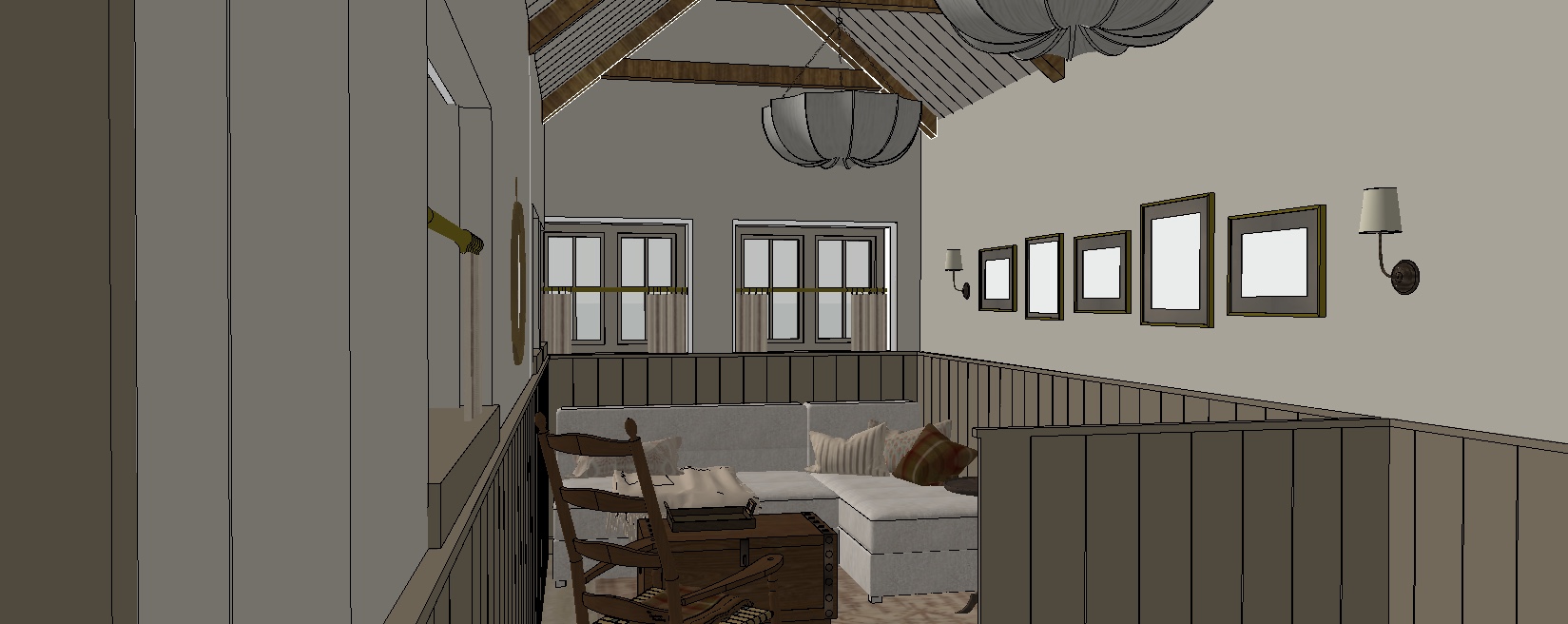 please create a photorealistic render of this image with soft lighting the ceiling is painted timber other that the structure the wall panelling is painted in a dark beige architecture