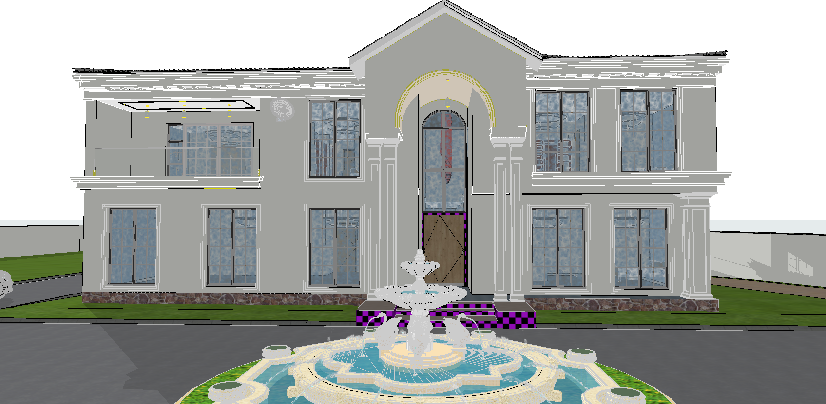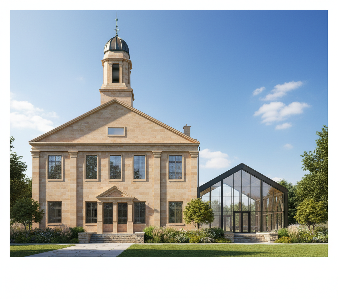 core style photorealistic neoclassical exterior visualization roof facade steep pitched hipped slate roof white limestone with sharp horizontal ashlar lines architectural features central triangular pediment smooth round columns arched windows both floors details sharp dentil friezes corner stone quoins white drapes lighting golden hour clear skies low angle sun warm internal tungsten glow no external fixtures