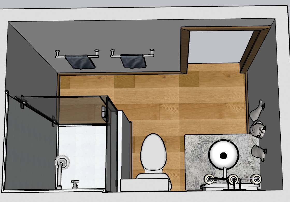 the walls are chantilly lace the shower is a subtle spotted marble panel add brightness from overhead lighting in the center of the room make the sink square undermount put the toilet paper on the wall to the left add a 4 matching backsplash on the back and side of vanity the baseboards are a wood stain the floor is a orange medium grainy luxury vinyl plank shower fixture is brushed nickel