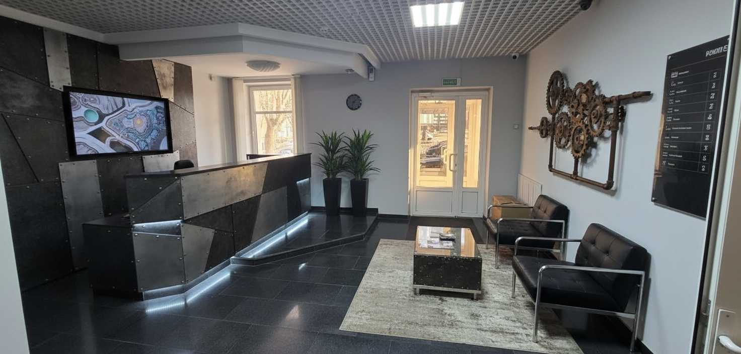 photorealistic architectural interior render of a public bathhouse reception area perspective view from corner angle the space has a reception desk on the left with fluted wood laminate lower panels and a textured stone or concrete fascia top surface light blonde wide plank hardwood flooring with visible grain running horizontally a patterned perforated or organically textured ceiling with recessed downlights and two matte white dome pendant lights hanging on brass fixtures a freestanding vertical rope or cord screen divider with a light oak wood header beam positioned centrally as a spatial partition two tub lounge chairs in dark slate charcoal woven upholstery with sage green cushions and light wood tapered legs around a small round side table a bench or daybed in warm taupe upholstery in the foreground right a bold abstract swirling colorful artwork panel visible behind the rope screen and on the far right wall a brass wall sconce mounted mid wall and a door with a light oak wood frame leading to changing rooms with multilingual wayfinding signage on the wall warm ambient artificial lighting from pendants and sconces casting soft pools of light and shadow across all surfaces natural light suggestion from ceiling analog film grain grainy collage render quality editorial interiors photography muted warm palette of cream blonde wood charcoal sage brass and stone deep shadows in corners strong contrast humid spa atmosphere medium format camera aesthetic slight vignette do not change the original materials