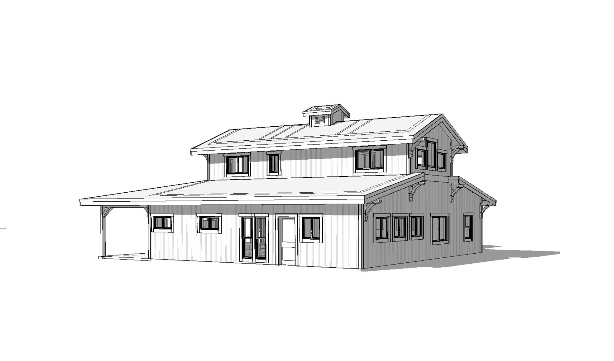 back view of a clean rustic barn home architectural exterior home rendered in cinematic daylight lighting with bits of blue skies and sunlight coming through the clouds barn home in a lush beautiful colorado countryside with green grass hills and a faint hint of a mountain range in the far distance in the background warm glow and reflections off of the windows select grade vertical wood siding green manicured landscape around structure with gardens and patches of grass black standing seam metal roof high fidelity photorealistic visualization crisp shadow falloff refined facade geometry soft atmospheric depth premium architectural photography mood ultra clean composition and materials photorealistic render black trim around the windows and doors prominent trees scattered around the property