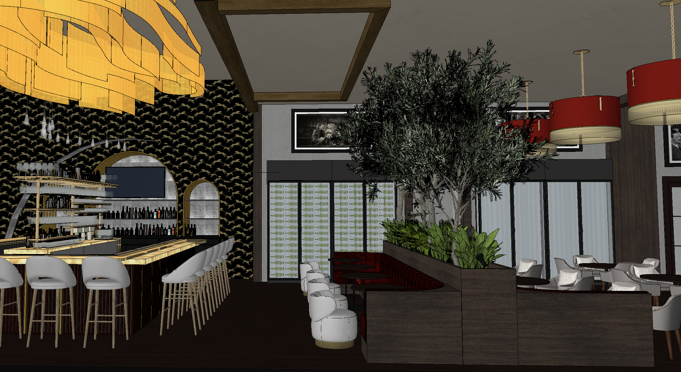 ultra photorealistic render of an upscale restaurant interior feature a glowing translucent onyx countertop with warm backlighting at the bar rich veining visible through the stone bar stools with light upholstery and wooden legs deep burgundy velvet curved booth seating with soft texture and subtle sheen large architectural planter with a mature olive tree rising above the seating dense natural foliage realistic trunk texture black and gold patterned accent wall behind the bar illuminated shelving with bottles warm layered lighting brass accents soft shadows cinematic atmosphere highly realistic materials accurate reflections hospitality photography style 8k detail