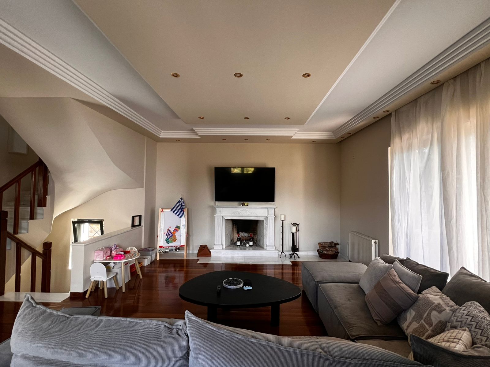 add a round minimal armchair left of the fireplace