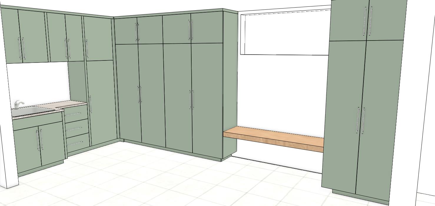 photorealistic ceiling is at top of cabinets there is a single pane window above the bench the green paint is not shiny