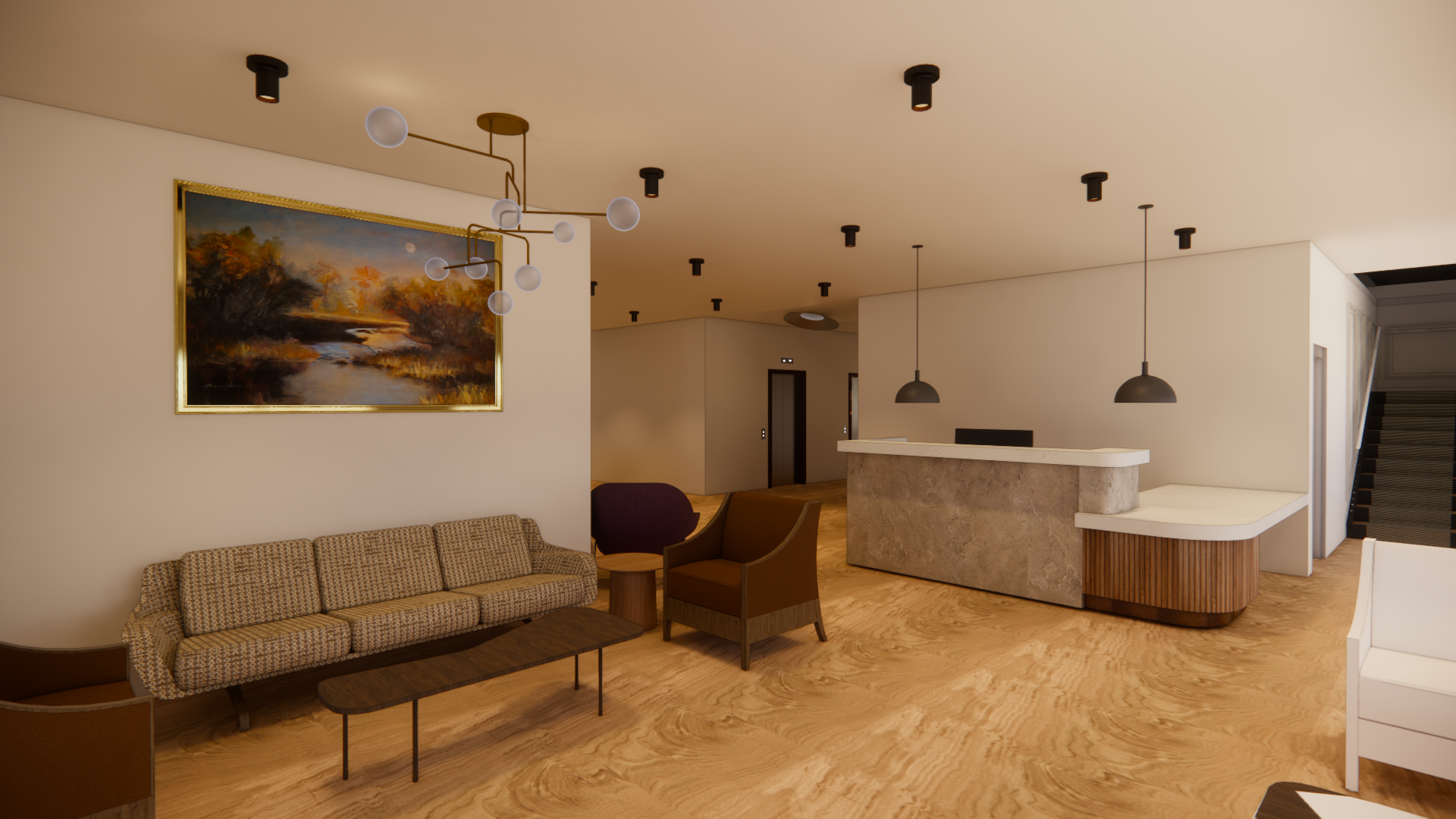 add realistic lighting effects to lighting fixtures change lights over reception desk to black add lighting to reception desk