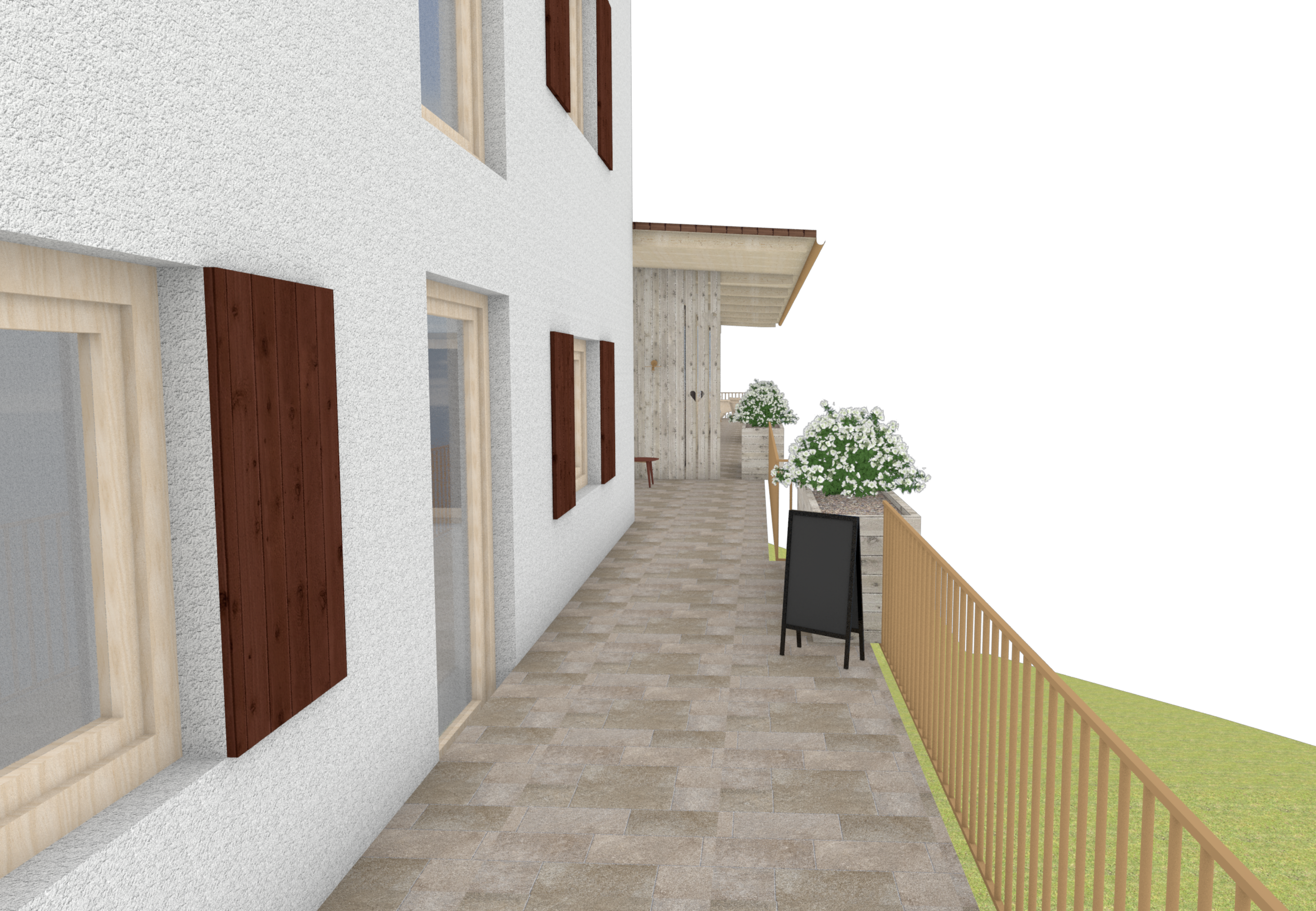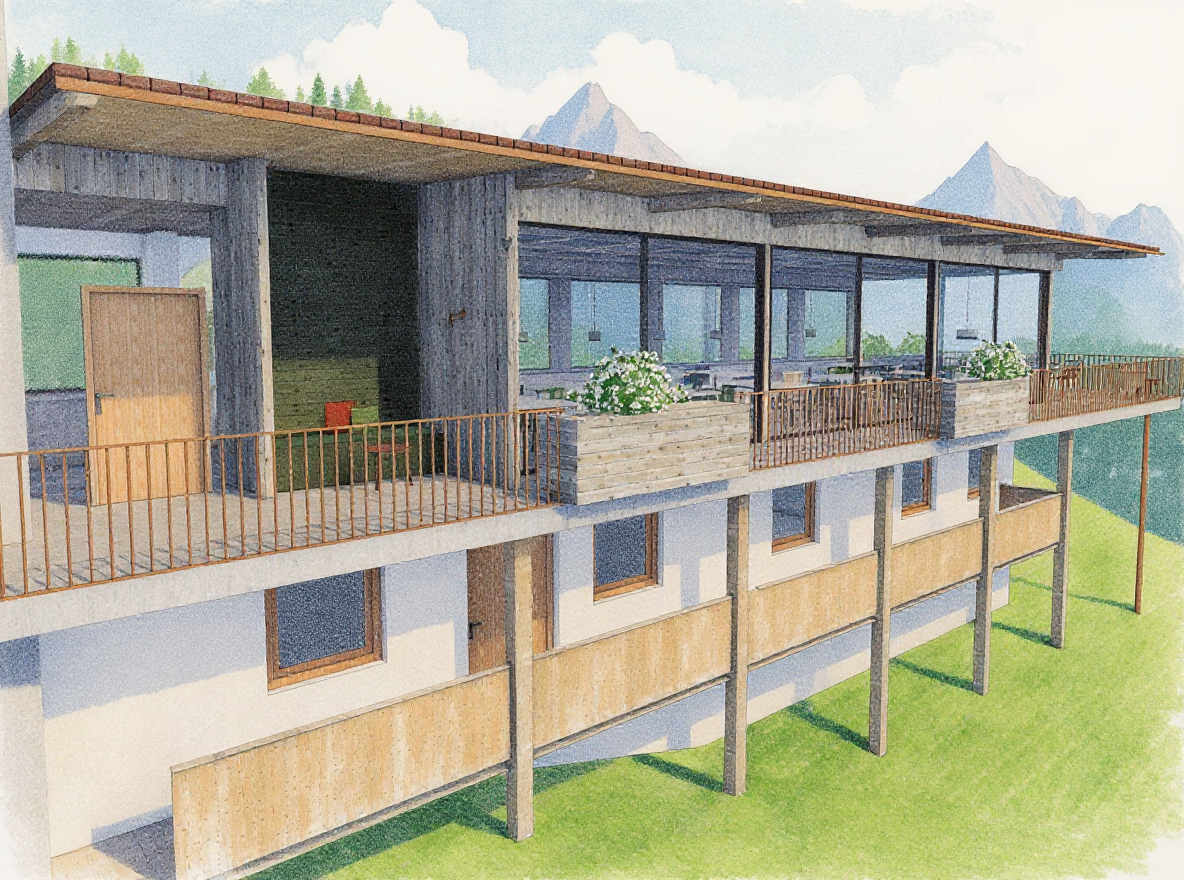 exterior shot stelle mir die renderdarstellung in einem skizzenstil aus der architektur dar ver ndere dabei nicht die geb udestruktur ver ndere den bildausschnitt nicht und behalte den exakt gleichen bildausschnitt bei stelle die materialit t naturgetreu in form des skizzenstils farbig dar der skizzenstil soll einer handzeichnung gleichen die farbigkeit und materialit t soll mit copic markern angedeutet werden es soll dabei nicht die gesamte farbfl che ausgemalt werden die struktur der materialien soll erkennbar sein reduziere die farbs ttigung so dass sie interpretationsspielraum l sst und nicht zu kr ftig erscheint f ge im hintergrund auf der linken seite bis zur rechten dachkante einen s dtiroler wald aus der region meran ein auf der rechten seite f ge bitte eine s dtiroler berglandschaft aus der region meran ein verwende das moodboard als referenz f r den oben beschriebenen skizzenstil