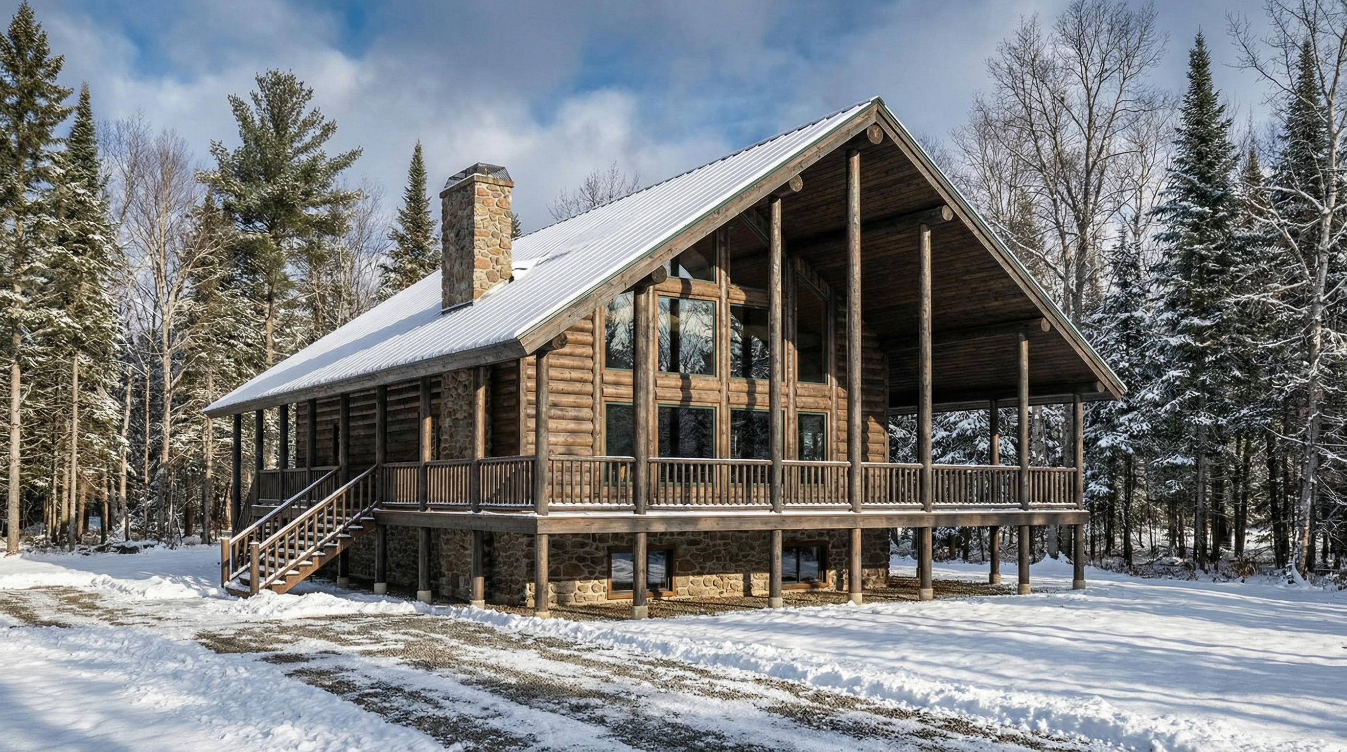 a modern rustic house with wood posts and accent beams retain the exact structure window arrangement deck columns rooflines foundation height trusses and proportions exactly as shown in the reference image add a gravel driveway extending toward the house and integrated naturally into the terrain surround the property with a lush dense forest of tall mixed evergreens and hardwoods sun is shining across the front of the home and grass create ultra realistic lighting crisp shadows detailed textures in the siding and glass reflections and a partly cloudy sky with light atmospheric depth render in hyper realistic architectural visualization quality 8k resolution it is the winter season darken all of the house colors